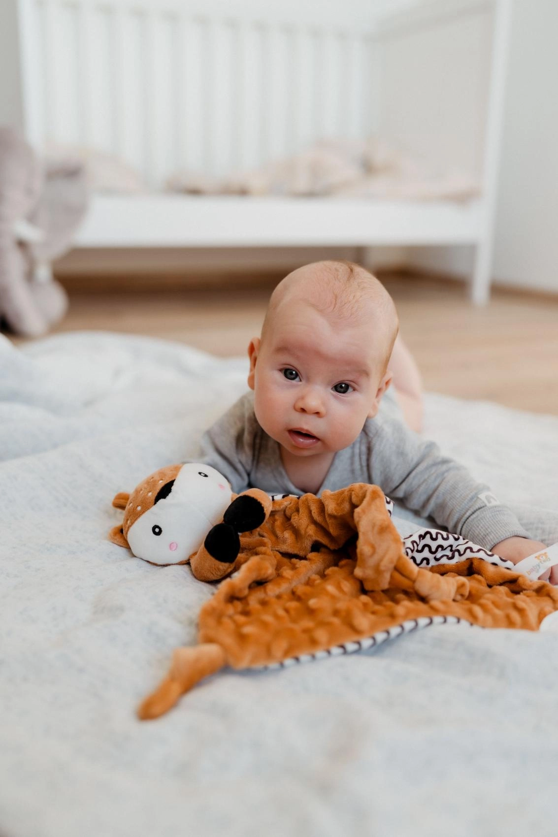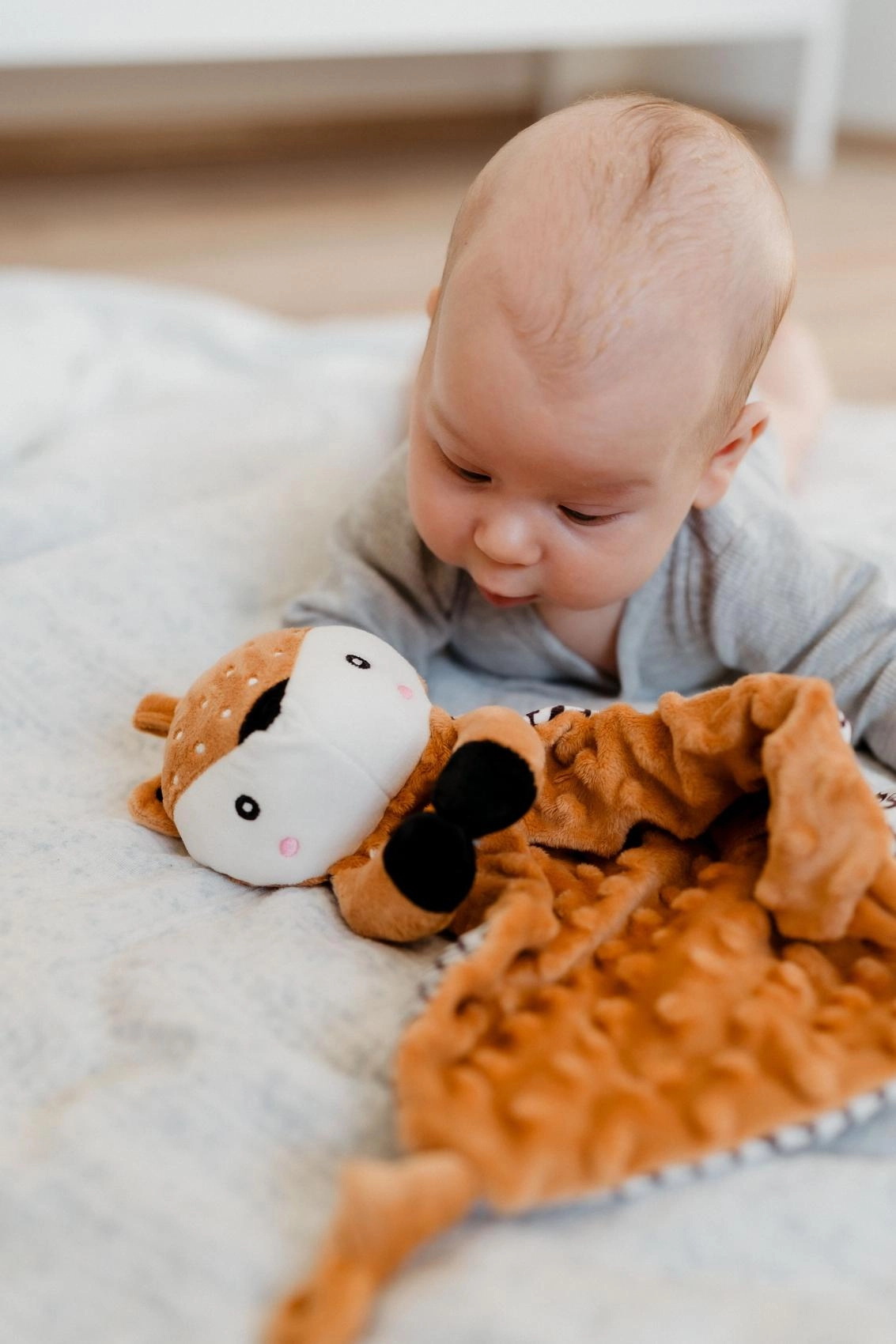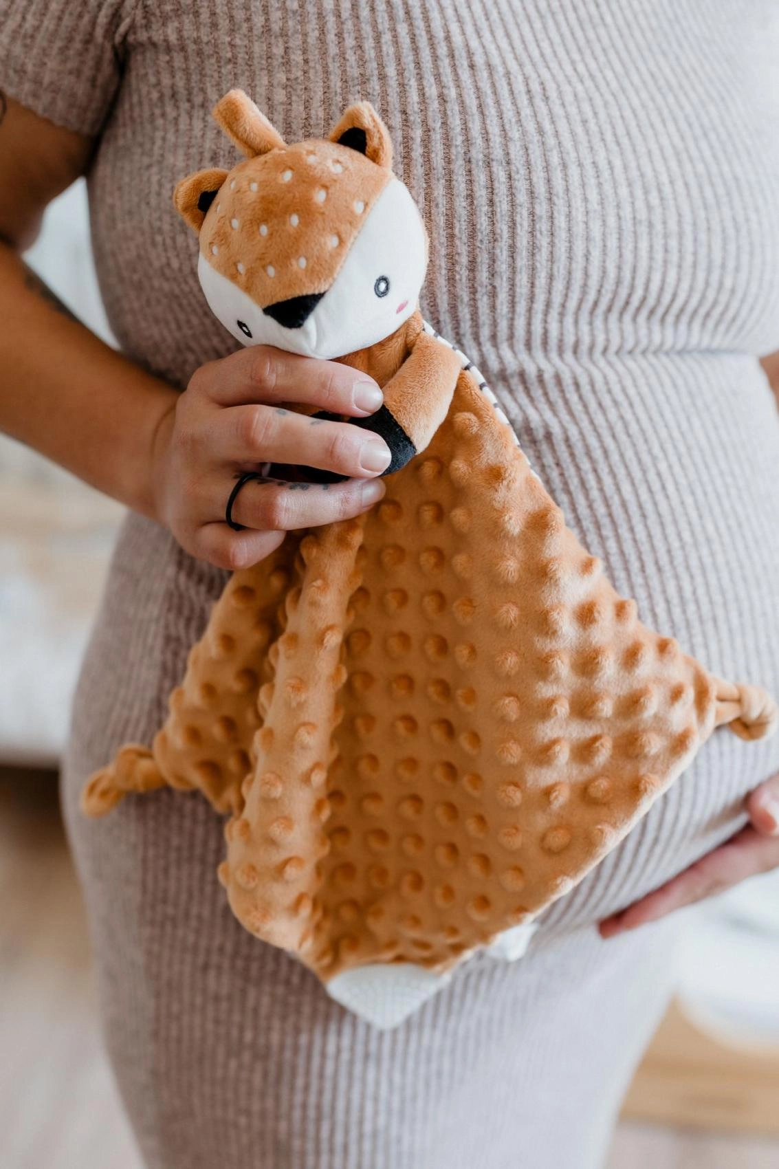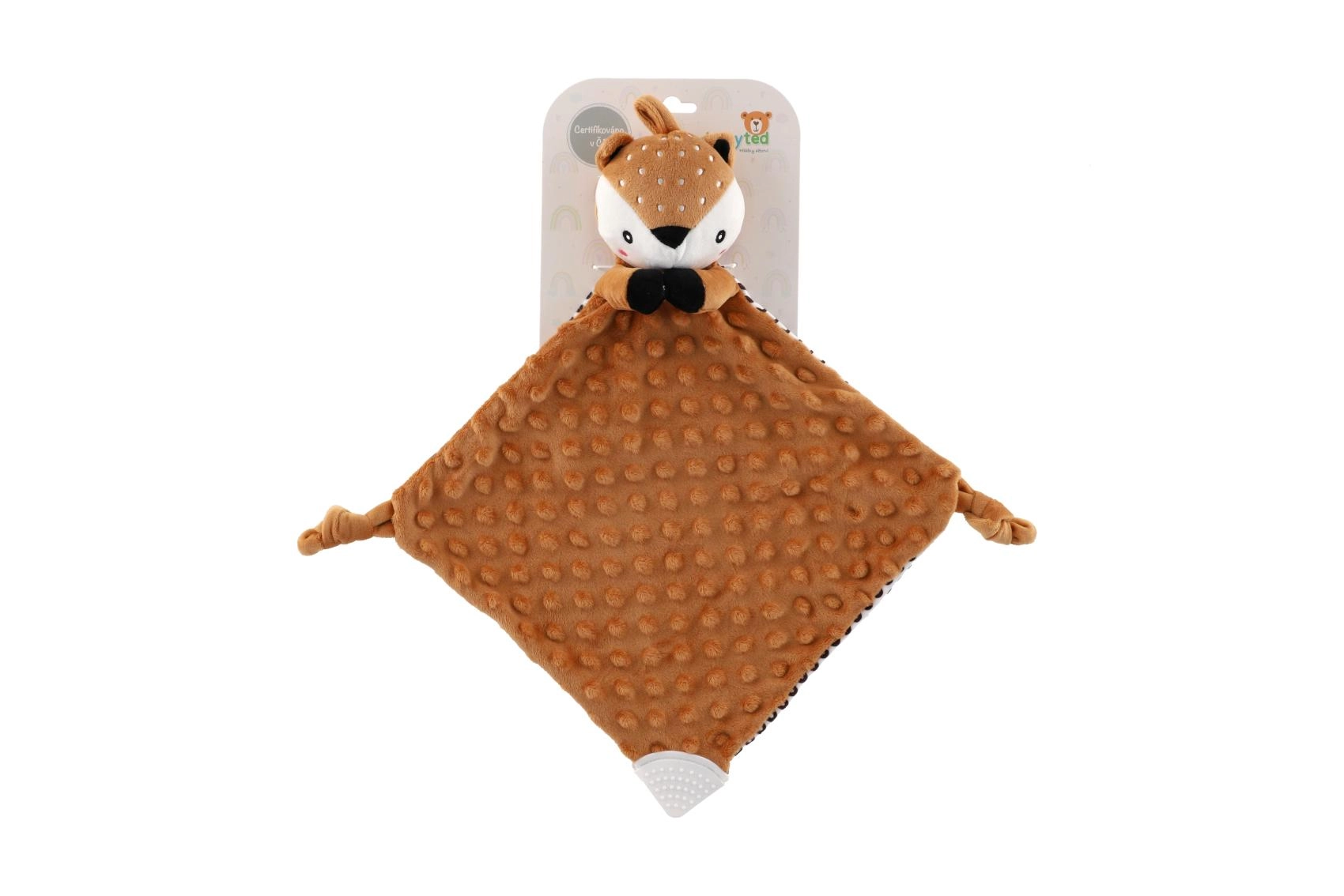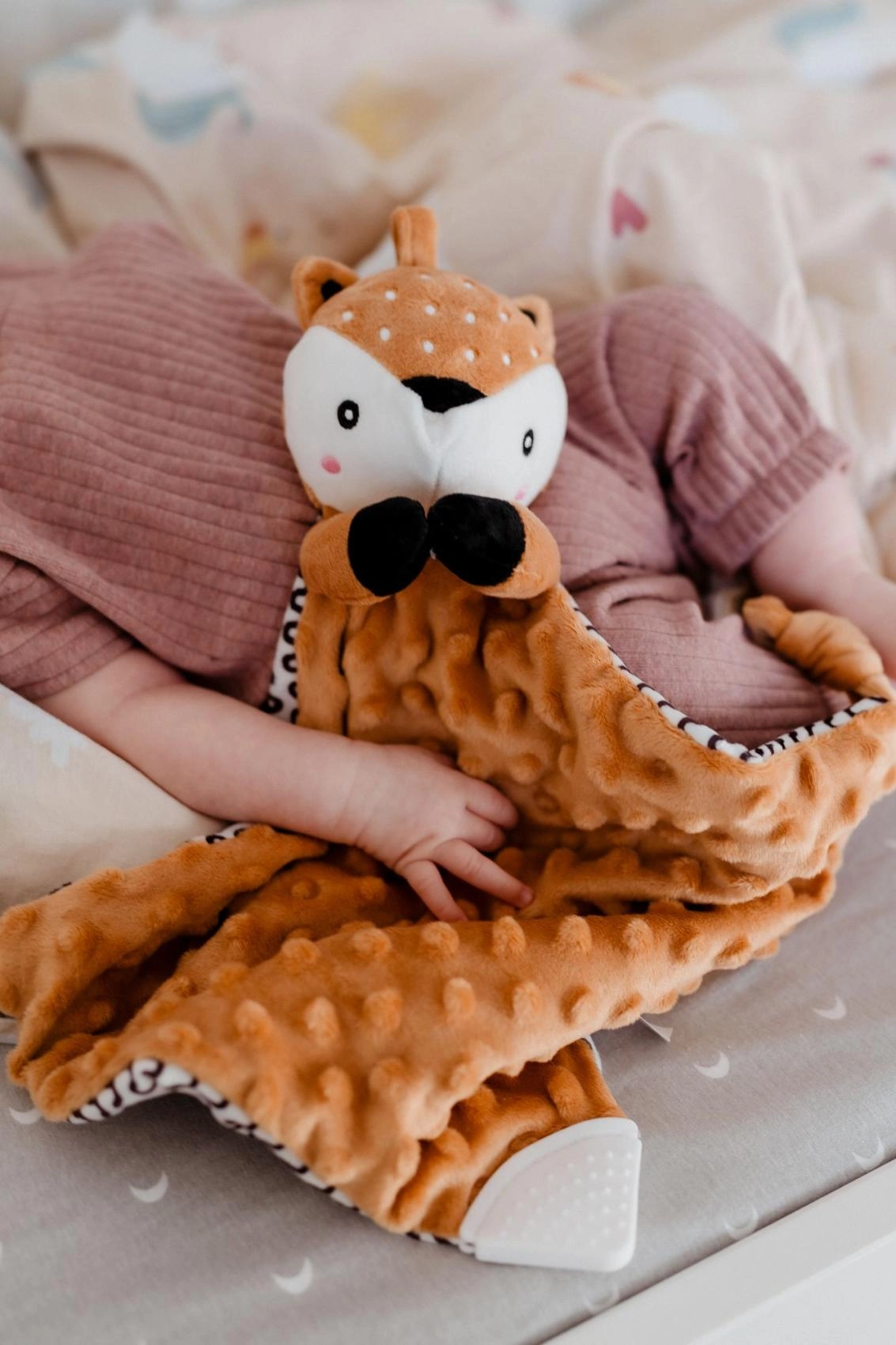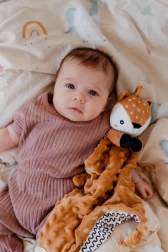 Ta mehka ninica s srnico združuje carto odejico in ljubkega plišastega prijatelja. Teksturirana minky tkanina z izbočenimi pikicami nudi bogato taktilno stimulacijo in prijetno cartanje. Vgrajeno grizalo pomaga dojenčku pri izraščanju zobkov, nežna ropotuljica pa podpira zaznavanje zvokov in koordinacijo.