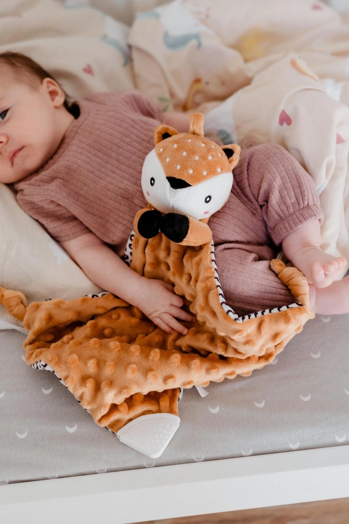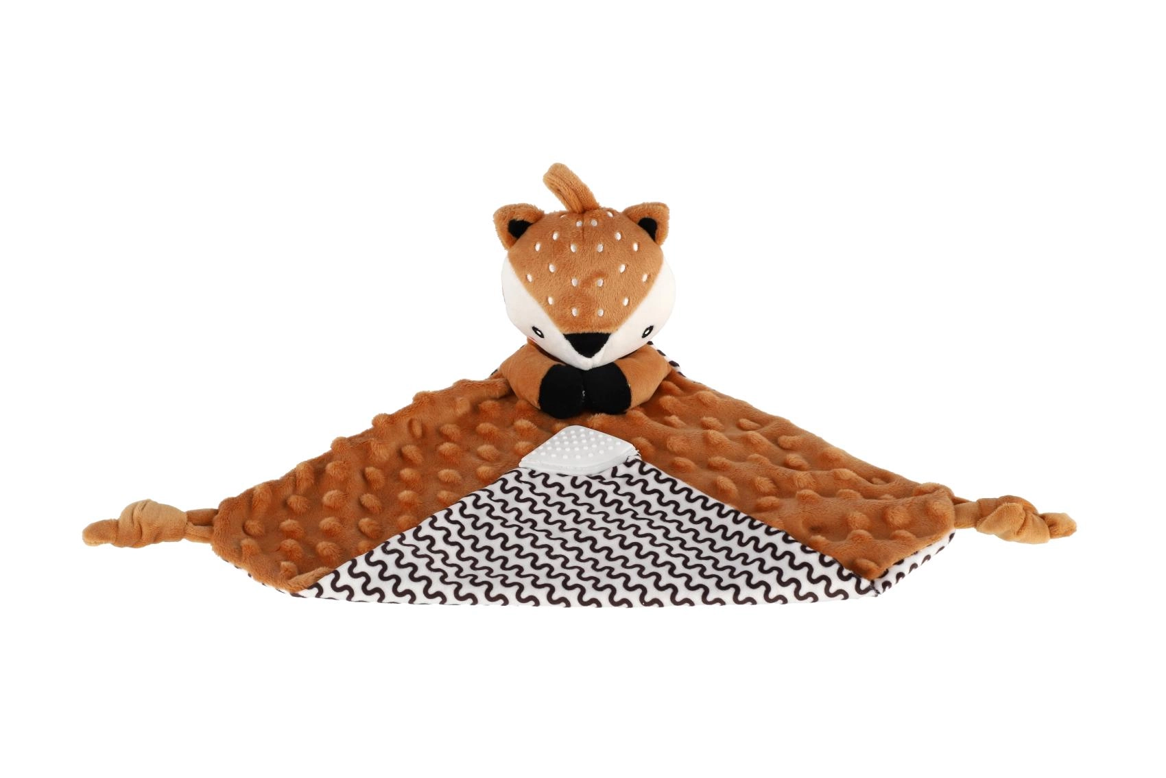 Mehko grizalo v kotu odejice pomaga pri izraščanju zobkov in nudi varno žvečenje kadarkoli čez dan.