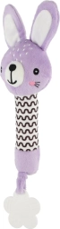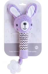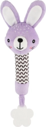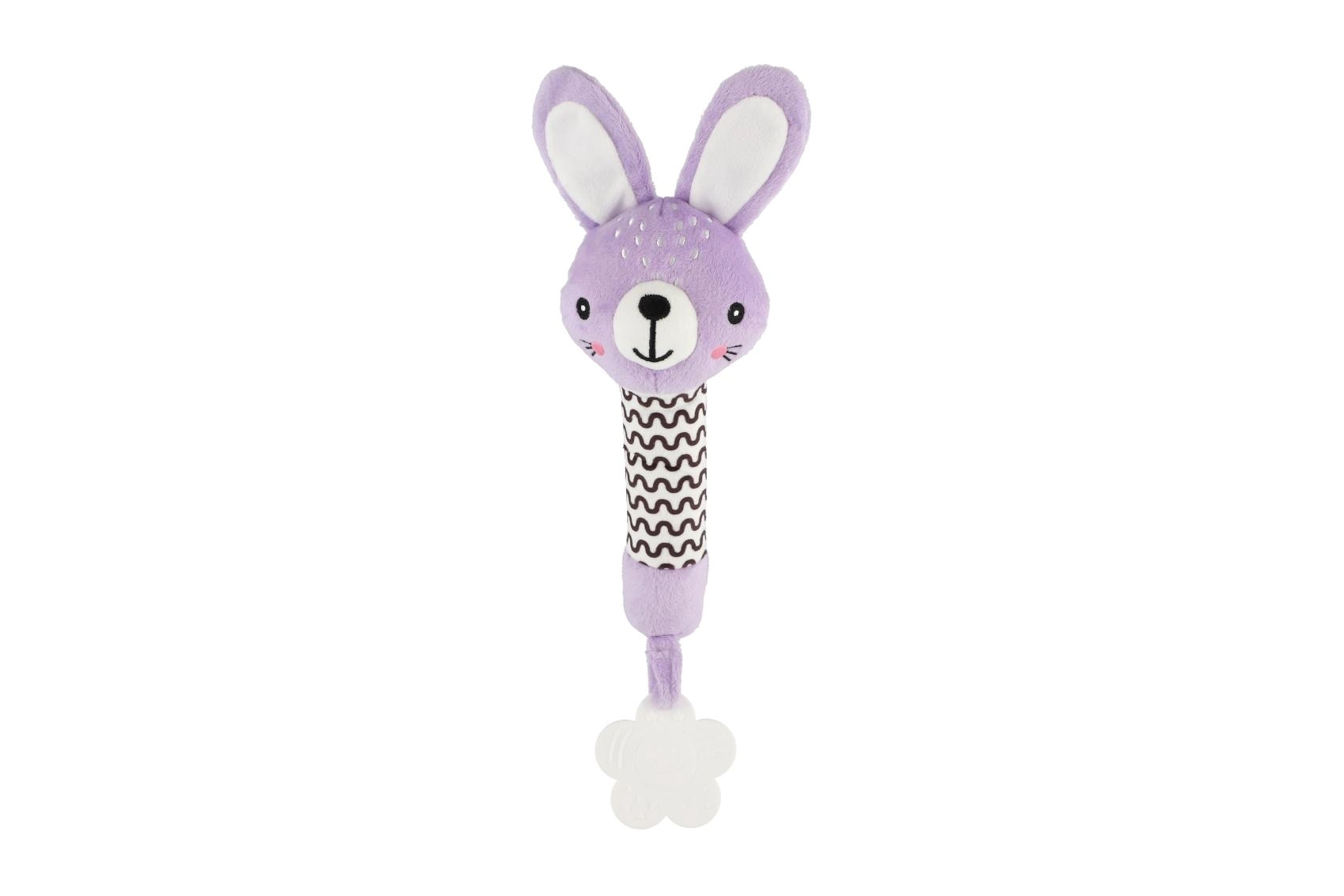 Vijolični plišasti zajček je idealna prva igrača za novorojenčke. Lahka zasnova in dolgo mehko telesce se odlično prilegata majhnim ročicam, ob pritisku pa odda nežen piskajoč zvok, ki naravno pritegne dojenčkovo pozornost in podpira zaznavanje zvokov.