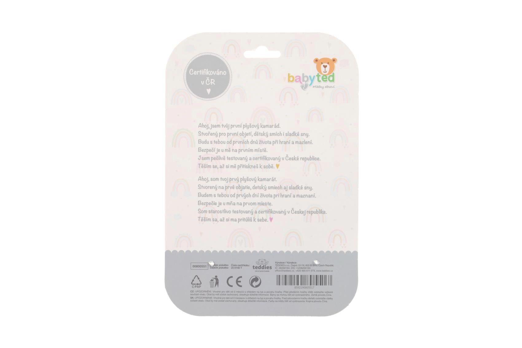 Na spodnjem delu je nameščeno mehko plastično grizalo v obliki rožice, ki lajša dlesni pri izraščanju prvih zobkov. Kontrastni črno-beli vzorec na ročaju podpira razvoj vizualnega zaznavanja, medtem ko varni, mehki materiali zagotavljajo prijeten dotik in udobje.