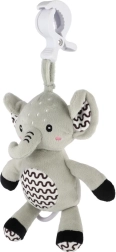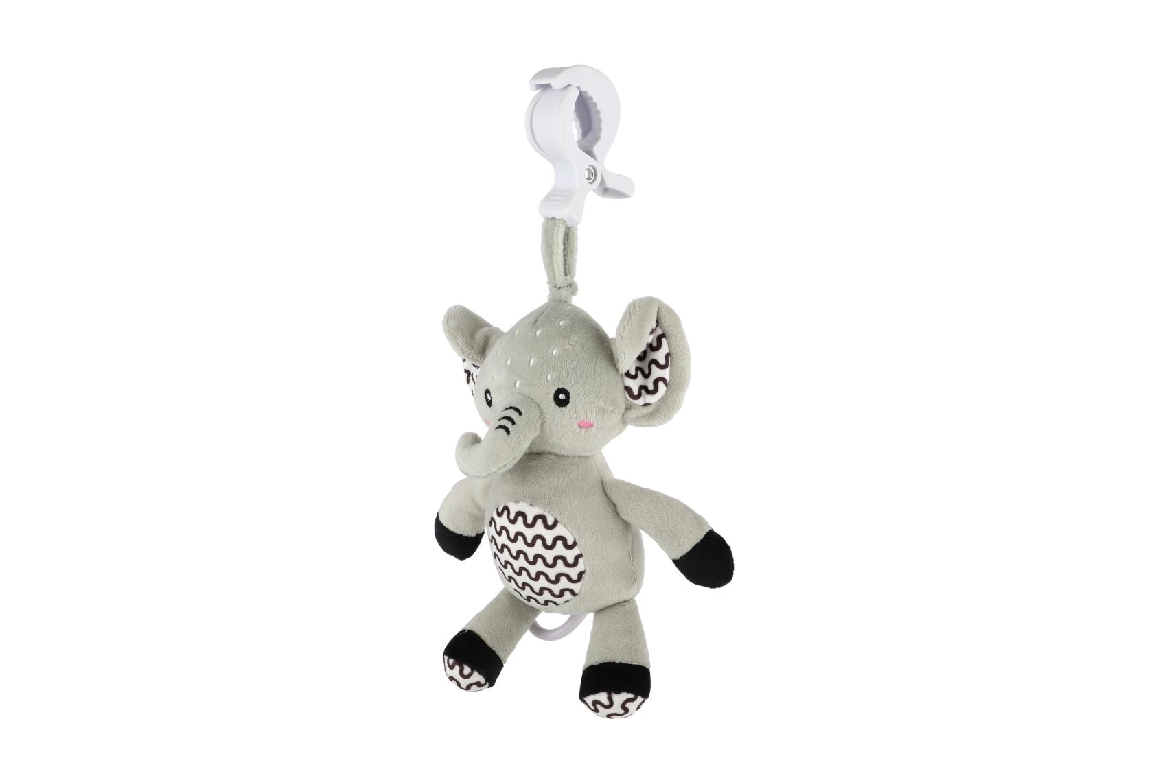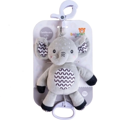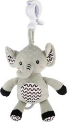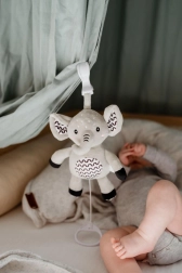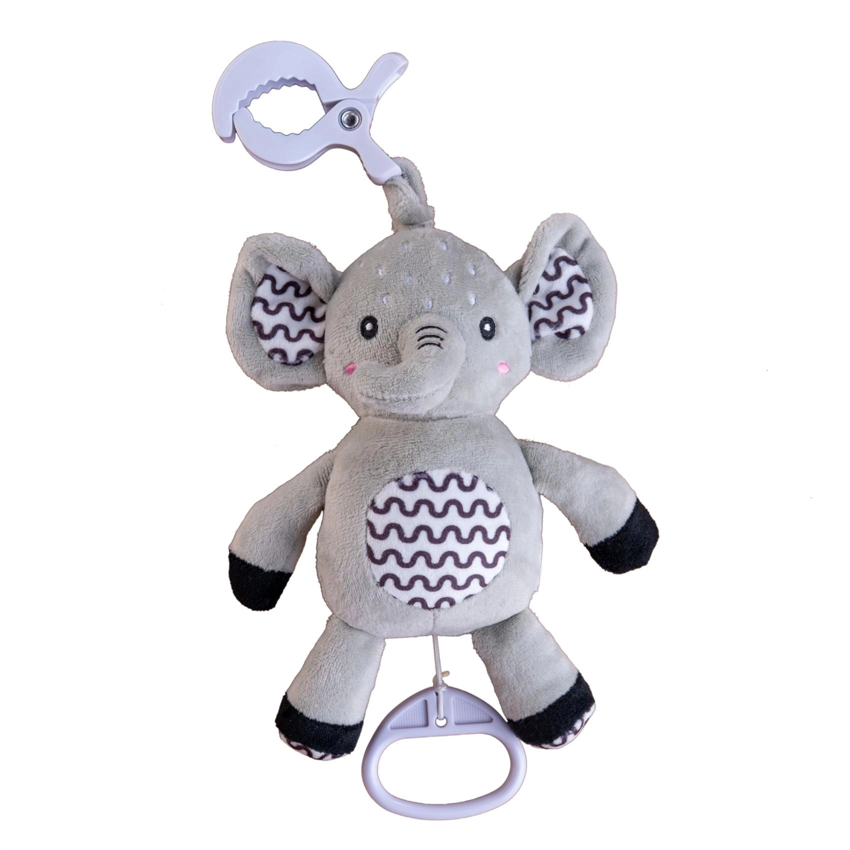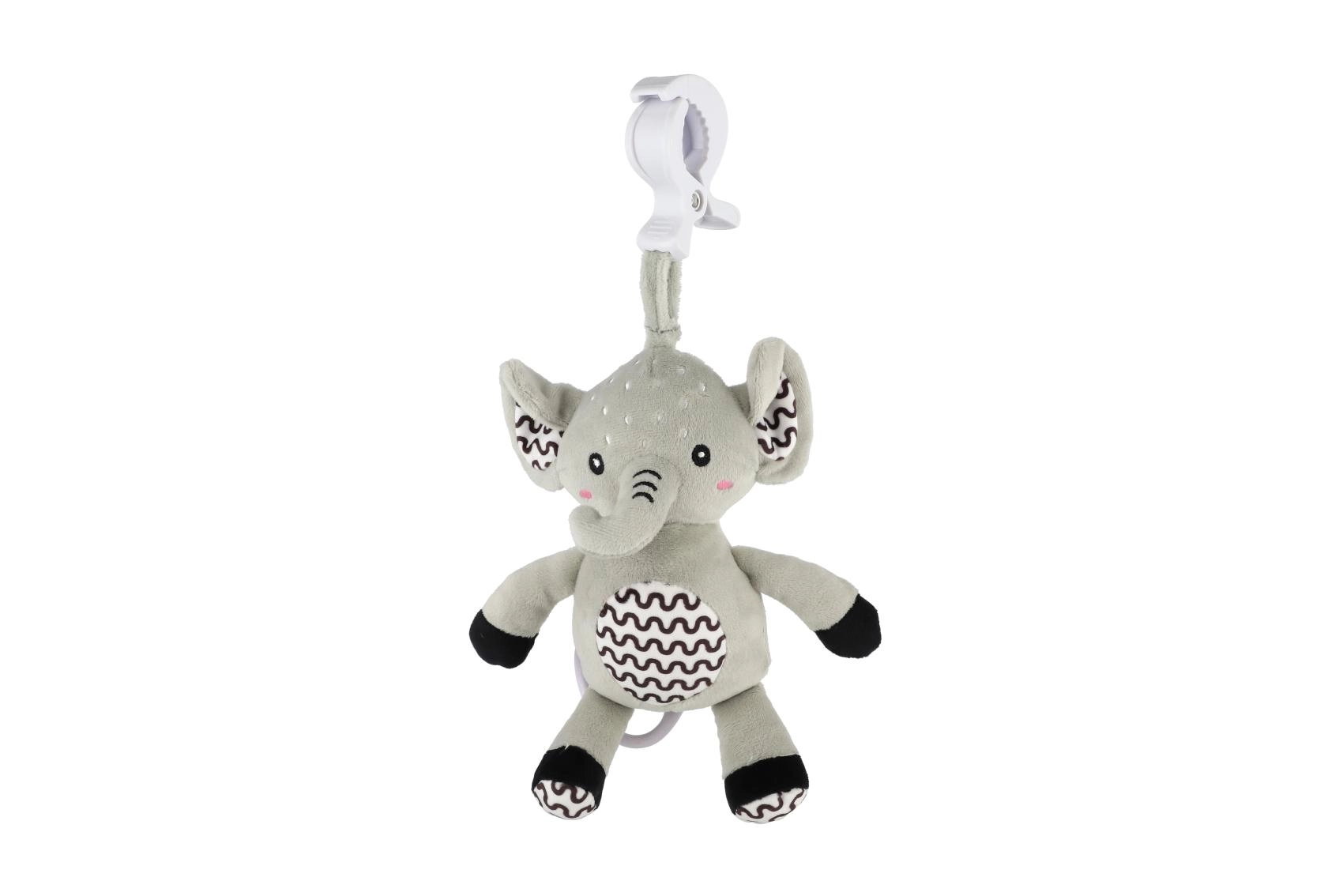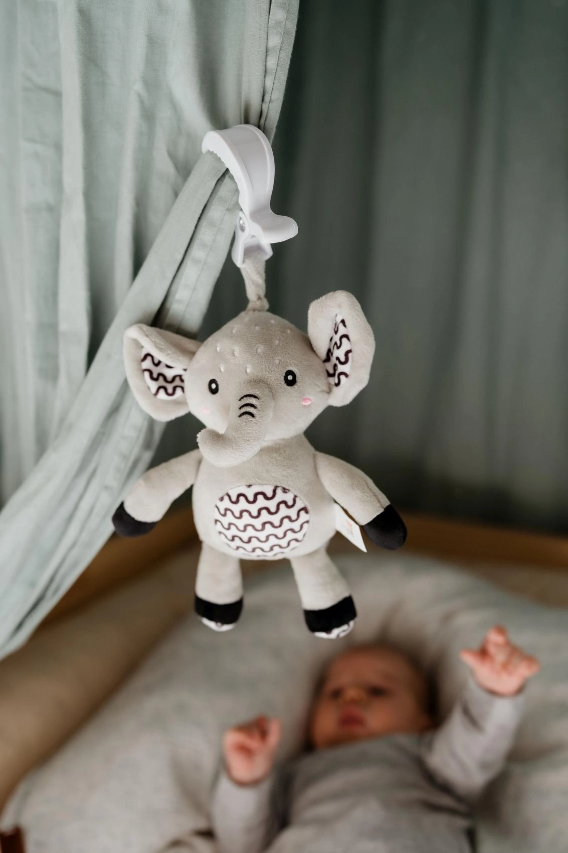 Ljubek plišasti slon z navijalnim glasbenim mehanizmom umiri dojenčka z nežno melodijo, z praktično sponko pa ga zlahka pritrdite na posteljico, voziček ali avtosedež. Mehek pliš je prijeten na dotik, kontrastni vzorci na ušeskih in trebuščku pa spodbujajo vizualno zaznavanje. Certifikat v RS zagotavlja varnost od 0 mesecev.