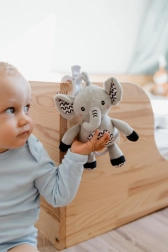 Ta mehki slon je idealna prva igrača za dojenčka. Po potegu za obroček se zažene nežna, pomirjujoča melodija, ki pomaga pri umiritvi in lažjem uspavanju. Zahvaljujoč vzdržljivi obešalni sponki ga pritrdite na posteljico, voziček, avtosedež ali igralni lok – vaš malček bo imel svojega prijatelja vedno pri sebi.