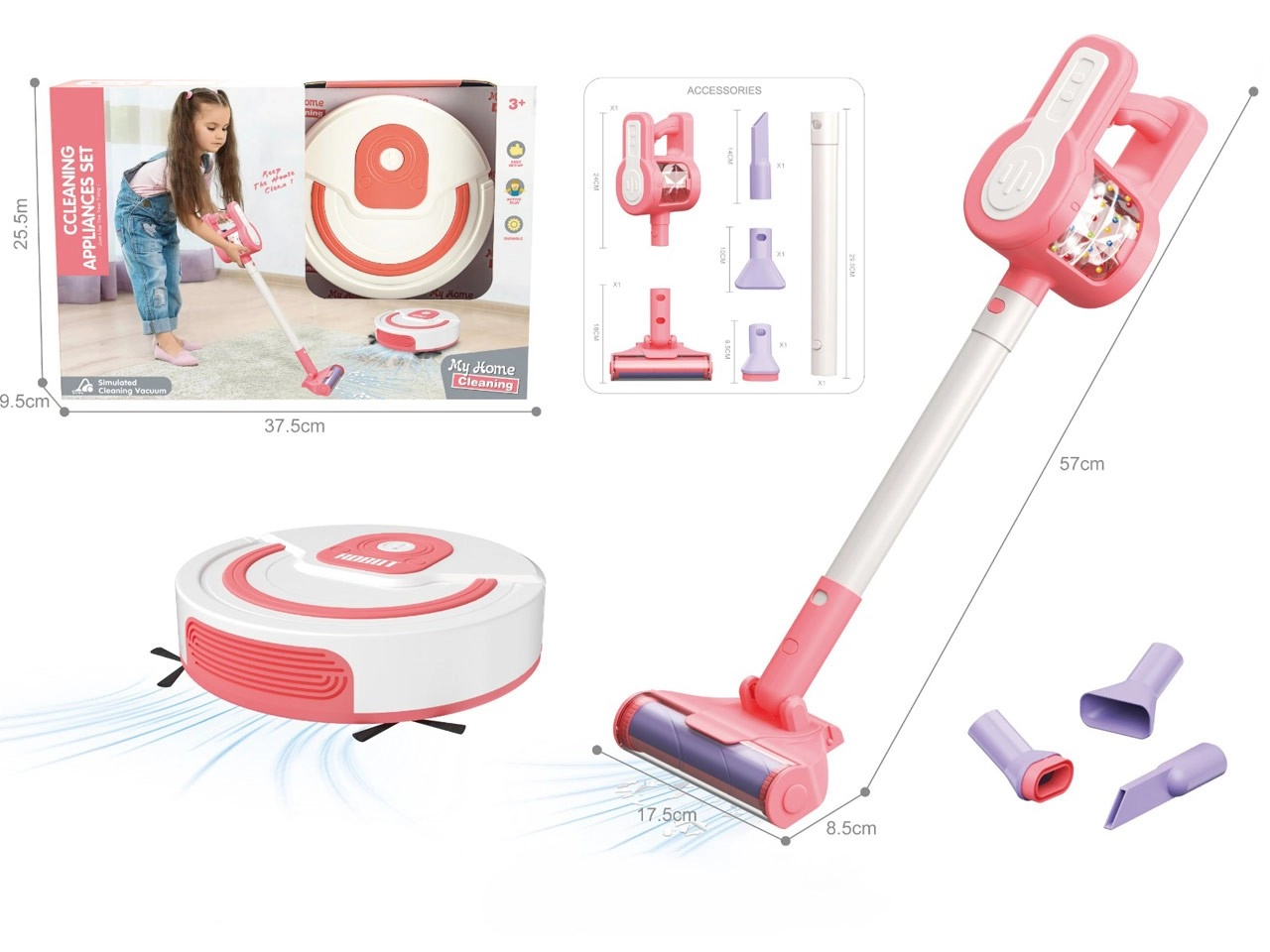 Otroški čistilni set prinaša realistično igro gospodinjstva in motivira otroke k pomoči pri vsakodnevnih opravilih. Palični sesalnik s prozorno komoro in vrtinčastimi kroglicami zvesto posnema pravo sesanje, medtem ko robotski sesalnik z učinkom sesanja in vrtečimi se ščetkami pritegne vsakega radovednega otroka.