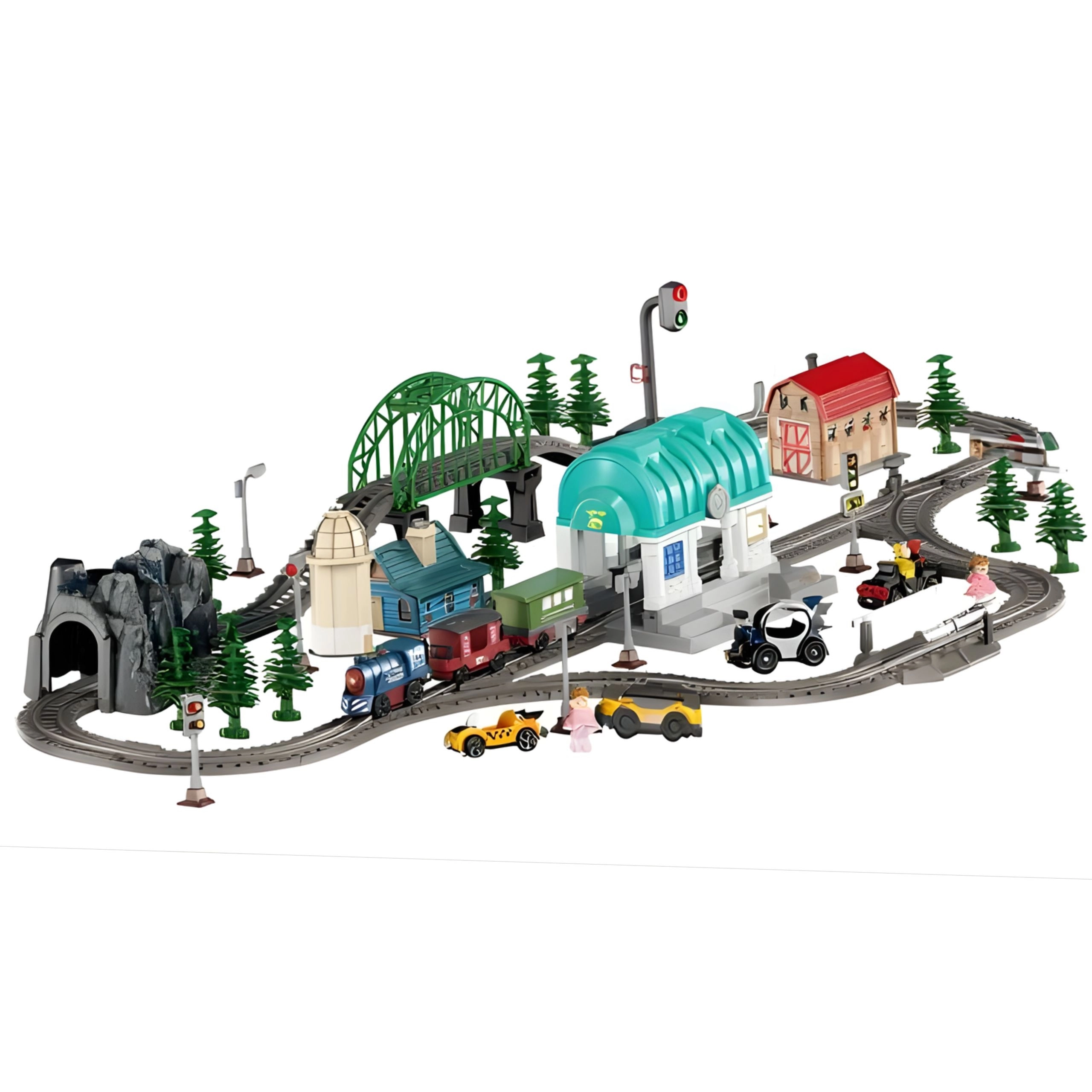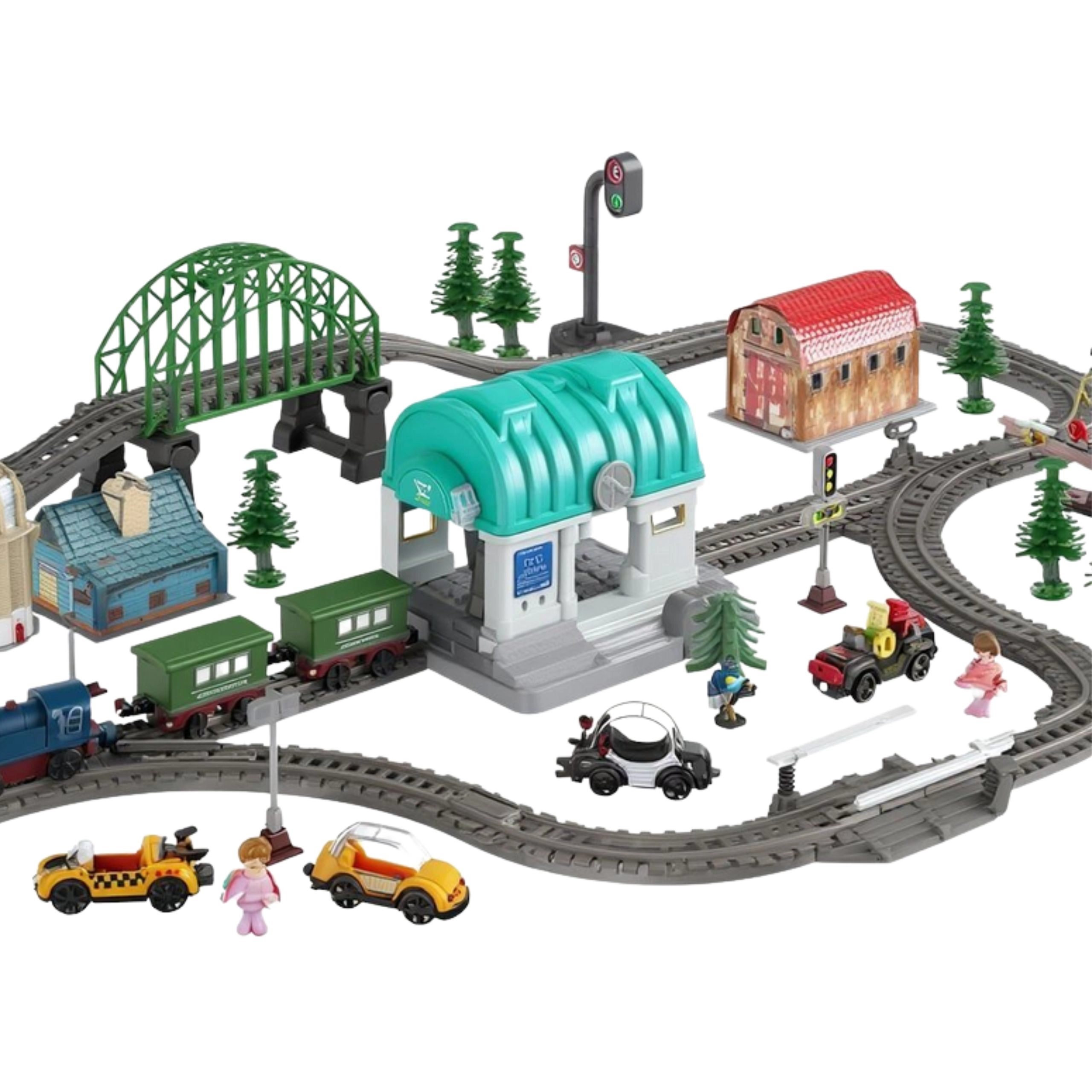 - 108 delov vključno s tiri, mostom, tunelom, postajo, avtomobilčki, figuricami in dodatki