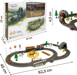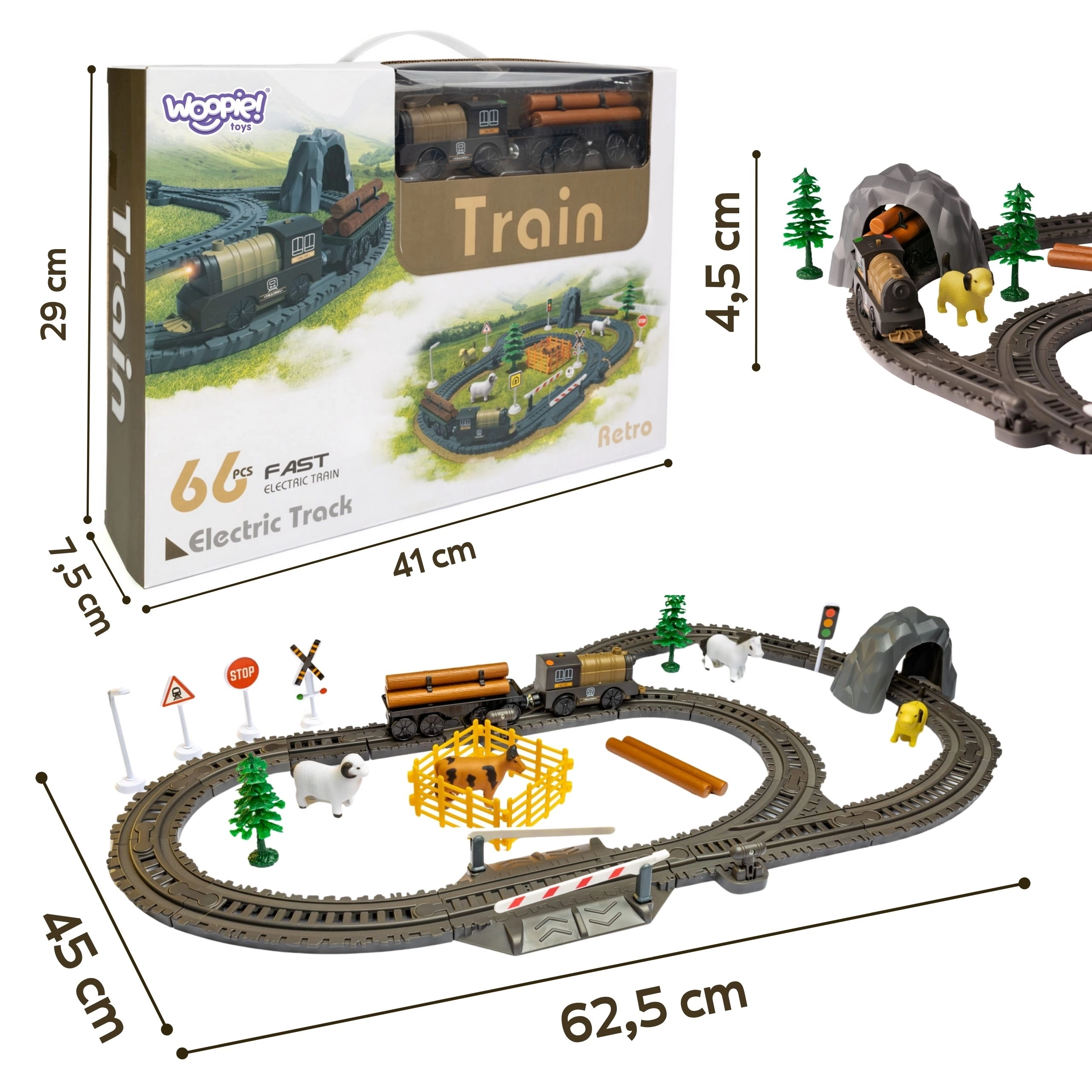 Ta retro električna vlakovna proga WOOPIE prinaša otrokom in odraslim ure zabave. Lokomotiva na baterije vozi naprej in nazaj, sveti s sprednjo lučjo in po barvitih tirih gladko pelje zahvaljujoč premišljenim kretnicam. Z bogato opremo je mogoče graditi različne trase in scenarije – od preprostih krogov do razvejanih prog.