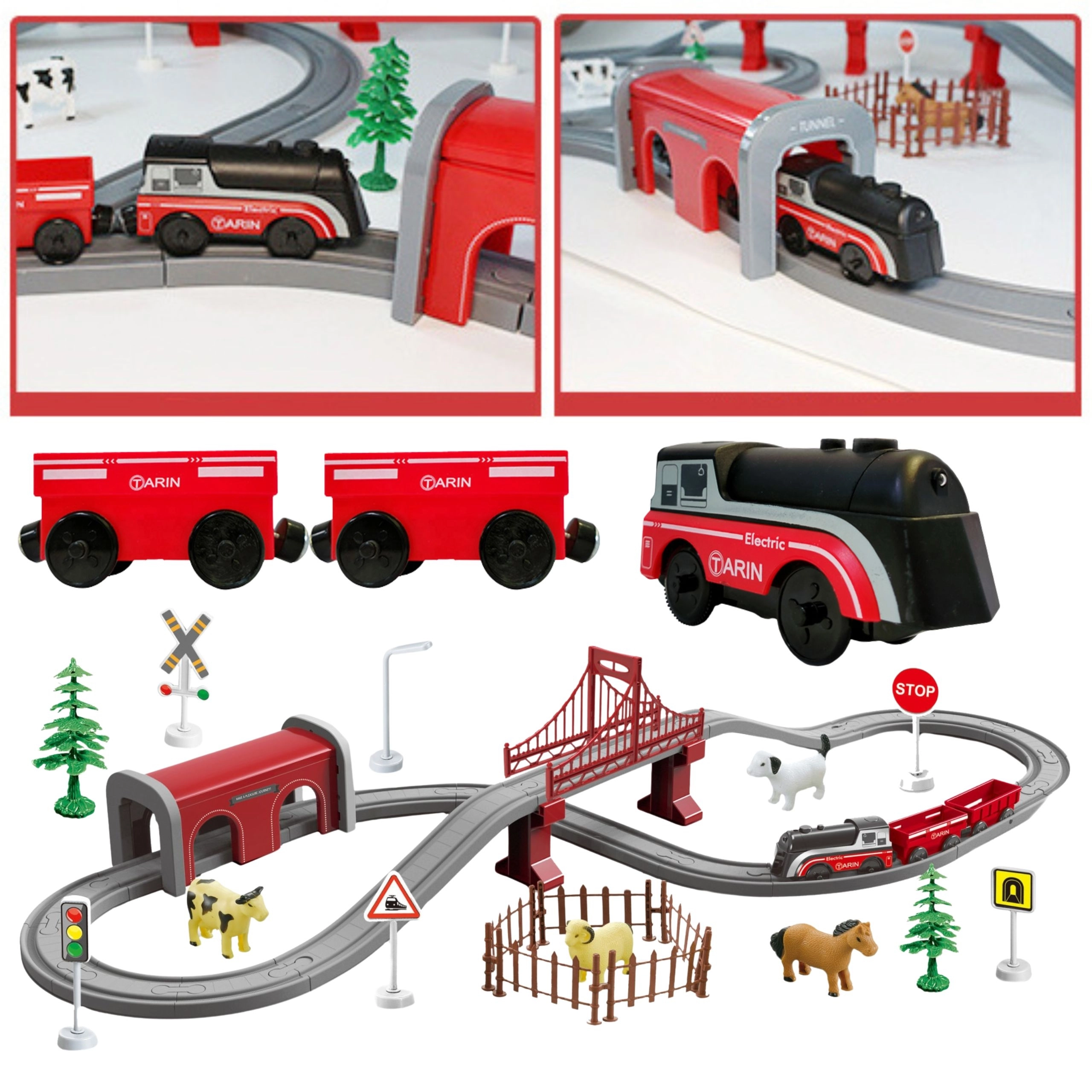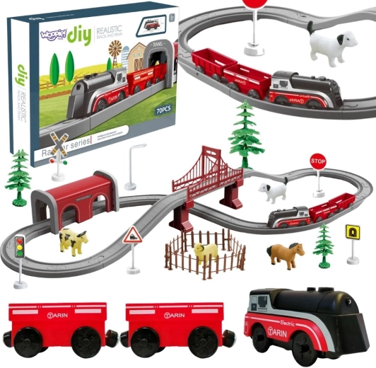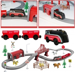 Ta električna vlakovna proga WOOPIE prinaša otrokom od 3. leta dalje dolge ure ustvarjalne zabave. Zaradi magnetnih spenjač se vagoni preprosto in varno povežejo, lokomotiva na baterijo AAA poskrbi za realističen premik, proga z mostom in predorom pa ustvarja privlačno kmečko kuliso.