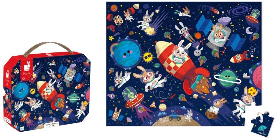 Stilne puzzle z vesoljskim motivom razvijajo otrokovo domišljijo, potrpežljivost in fino motoriko. Praktičen kartonski kovček z ročajem poskrbi, da lahko otroci puzzle vzamejo kamor koli – na obisk, počitnice ali v vrtec. Del pakiranja je tudi plakatna predloga, ki pomaga pri sestavljanju in spodbuja samostojnost.