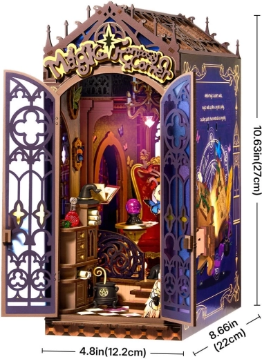 Ustvarite si doma svoj Čarobni kotiček – miniaturno sceno z vzdušjem starega čarovniškega kabineta. Ko prižgete LED, izstopijo obokana okna, rdeč naslanjač z visokim naslonom, vijačaste stopnice in kamin. Ne manjkajo police s svitki in stekleničkami napojev, čarovniški klobuk, lesena palica, bleščeči kristali ter črna mačka kot zvesti spremljevalec.