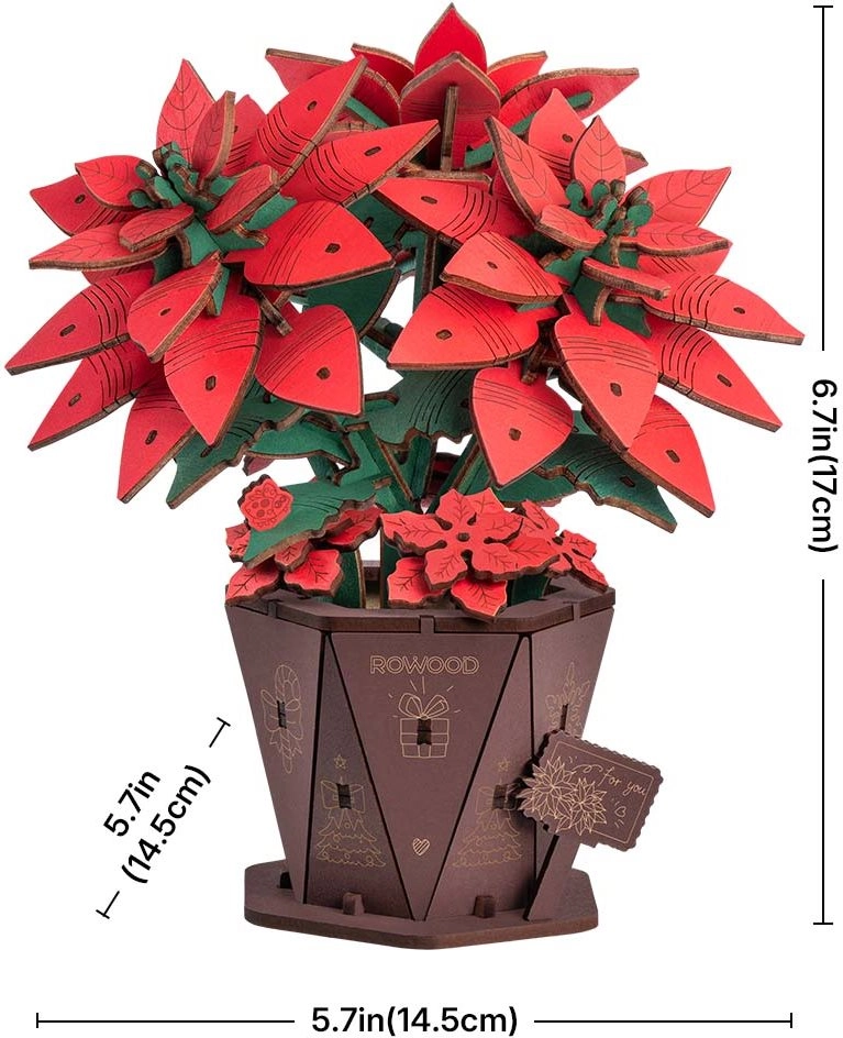 Ta elegantna 3D lesena božična zvezda v lončku je sestavljena iz lasersko izrezanih delov, ki so oštevilčeni za hitro in intuitivno montažo. Zahvaljujoč čvrsti konstrukciji ohranja obliko in po sestavi ustvari impresiven praznični okras z realističnimi listi in cvetnimi listi.