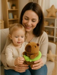 Ljubka plišasta kapibara z odstranljivim zelenim obročem z žabico prinaša mehko crkljanje, varno hipoalergeno polnilo in čaroben dizajn za otroke in odrasle. Kompaktna velikost 20 cm je idealna za na pot, v vrtec in v posteljico.