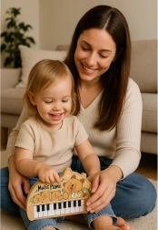 Vstopite z otroki v svet glasbe s čudovitim mini klavirjem z motivom kapibare. Zahvaljujoč 22 tipkam si mali glasbeniki zlahka osvojijo preproste melodije in ritem. Pastelne ilustracije in prijazen dizajn naravno vabijo k igri ter razvijajo odnos do glasbe že od malih nog.