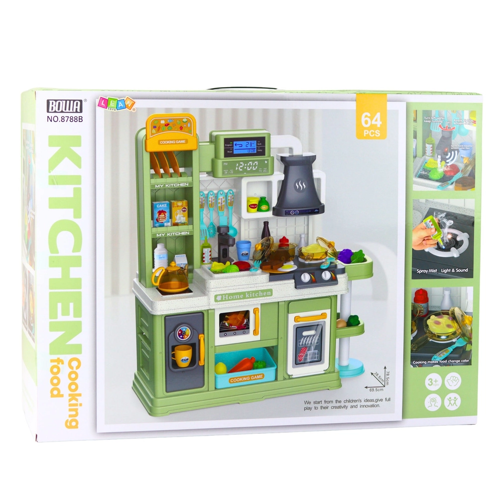 Ta dovršena kuhinjica ustvarja vzdušje prave kuhinje: realistični gorilniki oddajajo zvoke kuhanja in pečenja, osvetljena napa poskrbi za učinek moderne linije, korito s kroženjem vode pa deluje na gib roke ali z obračanjem pipe. Posebna živila menjajo barvo ob segrevanju, kar spodbuja radovednost in posnemanje resničnih kuharskih postopkov.