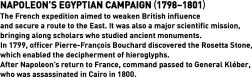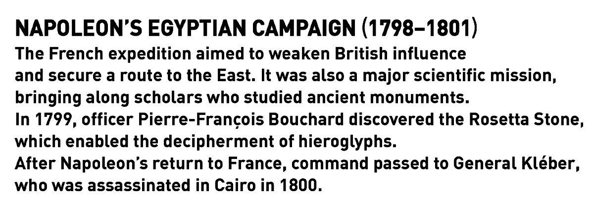 General Kléber, poročnik Bouchard in mameluk s sabljo ter bogatimi detajli uniform podpirajo igro zgodb in poučne prizore.