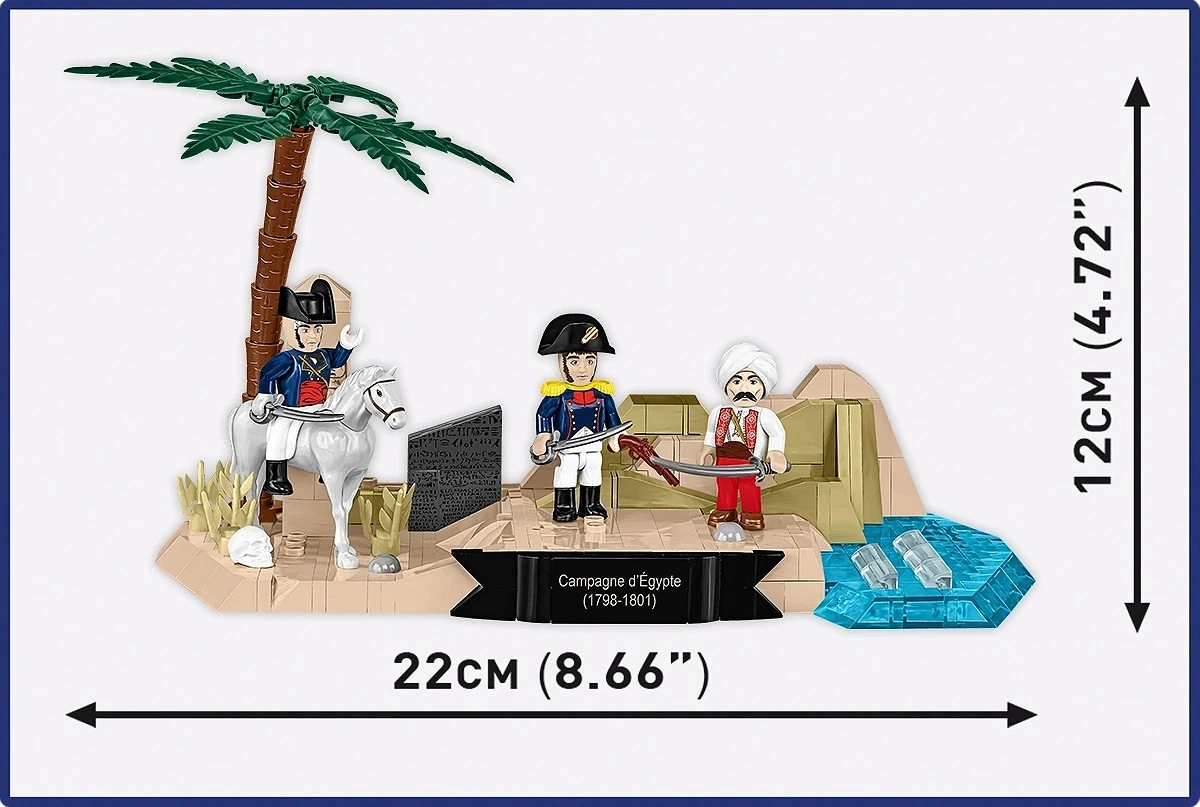 Odkrijte napeto zgodbo Napoleona ob Nilu. Seti COBI iz serije Napoleonic Wars prinašajo zgodovinsko vzdušje v obliki zbirateljske diorame: palma, odsek nilske pokrajine in edinstven model Rosettskega kamna s trajnim potiskom. Ne manjkajo karizmatični liki – general Jean‑Baptiste Kléber, poročnik Pierre‑François Bouchard in mameluk s tradicionalno sabljo.