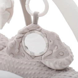 Vključeni so priljubljeni elementi: ogledalce, šumeči deli, piskalica, mehko grizalo, zvonček in igrača z vgrajenim predvajalnikom melodije. Podloga je odlična doma in na poti, enostavno prenosljiva in nudi mehko podlago za vsakodnevno igro.