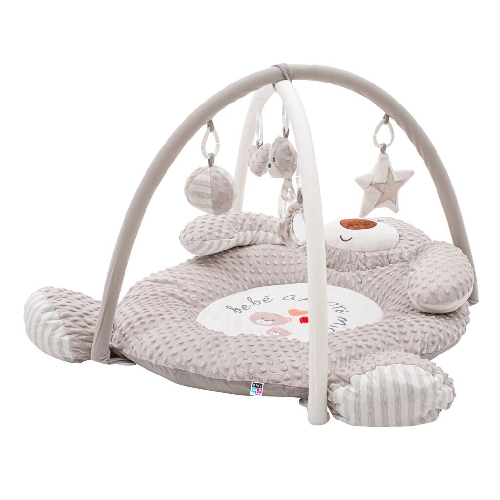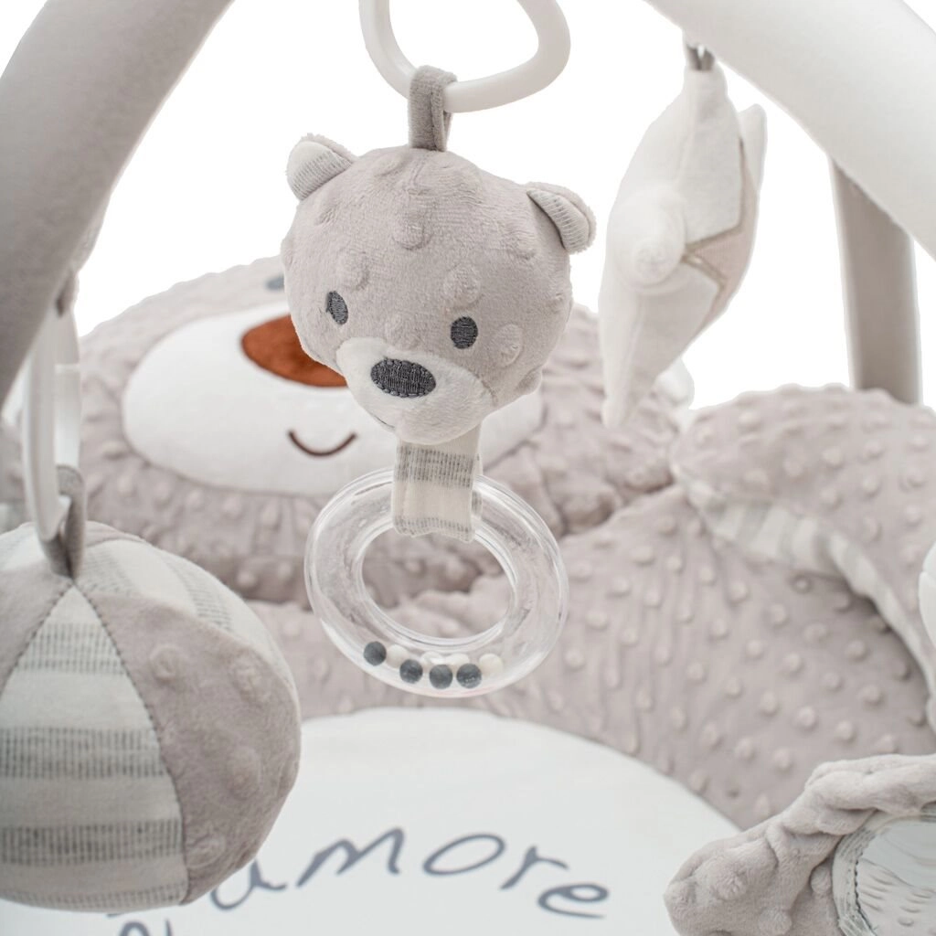 Ta razkošna igralna podloga iz nežnega minkyja z izboklinami ustvarja prijeten in varen prostor za vašega malčka. Kontrastni vzorci, raznolike teksture in interaktivni elementi podpirajo razvoj vida, tipa, koordinacije in fine motorike. Vgrajeni lok z odstranljivimi igračami motivira otroka k stezanju, prijemanju in obračanju.