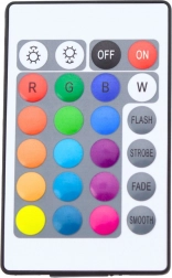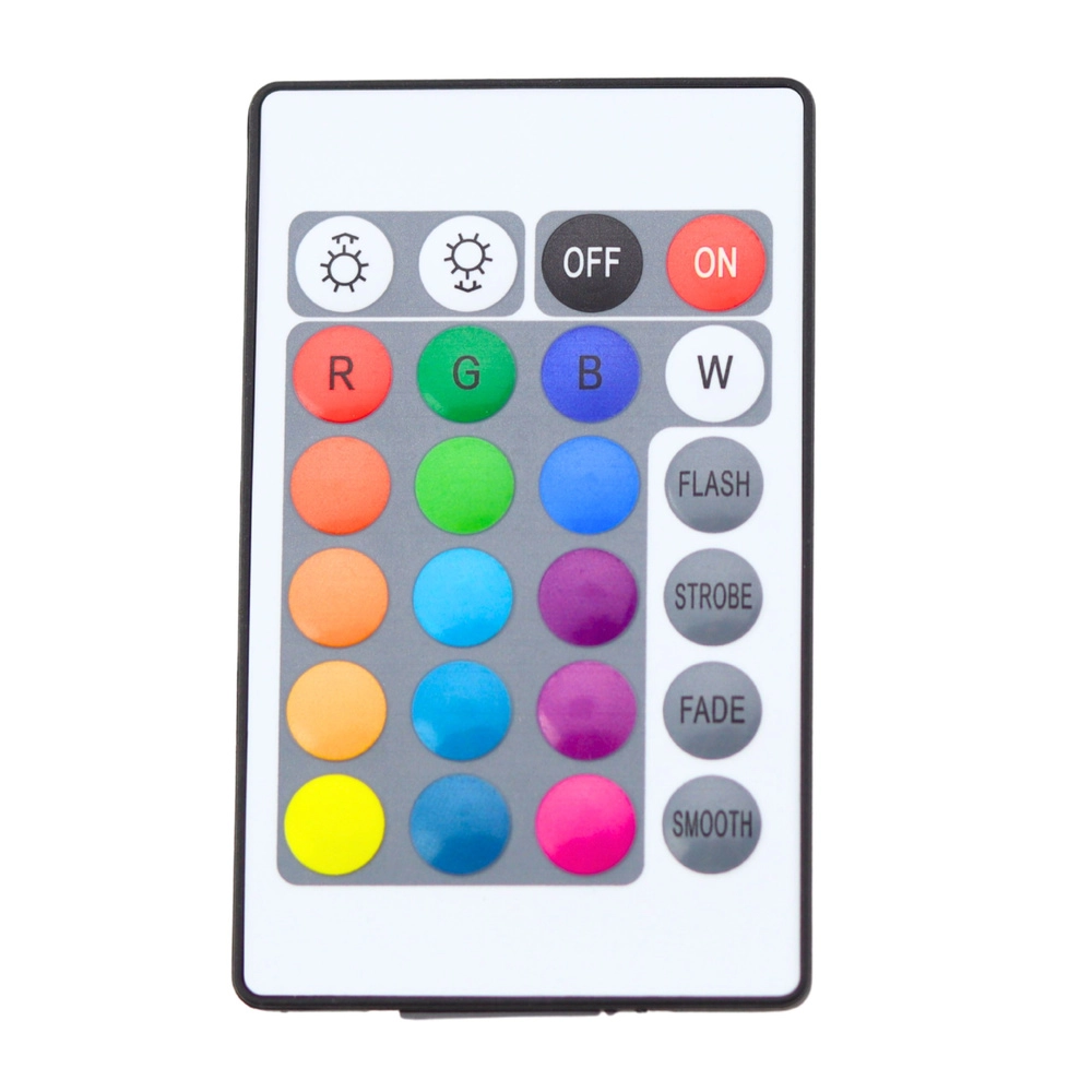 Spremenite barvo, svetilnost ali način od kjerkoli v prostoru. Daljinec ponuja hitre izbire R/G/B/W ter gumbe za svetilnost in učinke.