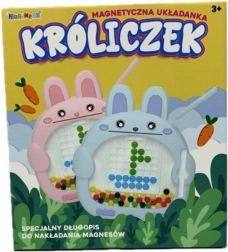 Zabavna magnetna mozaična tabla v obliki zajčka razvija otroško domišljijo in spretnost. S pomočjo magnetnega peresa otroci zlahka premikajo barvne gumbke in sestavljajo slike po predlogah ali lastni domišljiji. Priloženi so barvni magnetni gumbki, magnetno pero v držalu in kartice s predlogami. Odlična pripomoček za fino motoriko, kreativnost in zbranost.