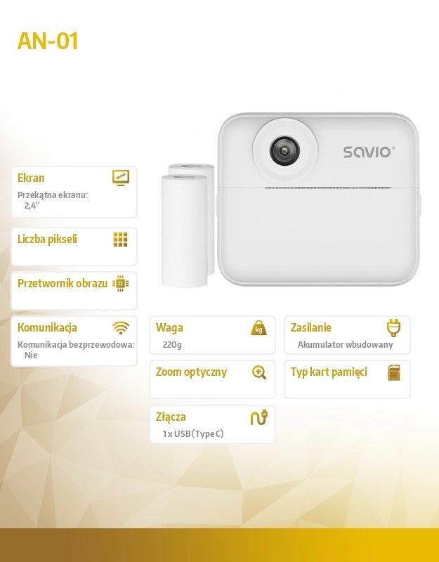 Otroški fotoaparat SAVIO AN‑101 združuje preprosto uporabo z bogato opremo za kreativno zabavo. Termični tisk omogoča takojšnje tiskanje črno‑belih posnetkov brez stroškov za črnilo. Širokokotni objektiv z vidnim kotom 90° in ločljivostjo do 48 MP zagotavlja ostre in podrobne fotografije ter videe.