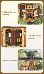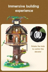 Model navduši z bogato opremo in funkcijami: dvigalo, ki ga upravljate z vrtljivim gumbom na vrhu drevesa, zložljiva polkna, odpirajoči se deli za vpogled v notranjost ter LED luči prek USB, ki poudarijo podrobnosti pri razstavljanju. Stavebnica je odlična za razvoj potrpežljivosti in ustvarjalnosti, hkrati pa je čudovita dekoracija interierja.