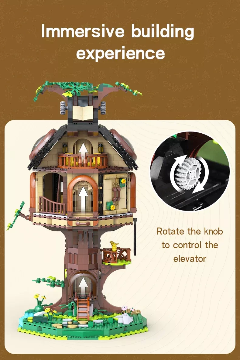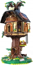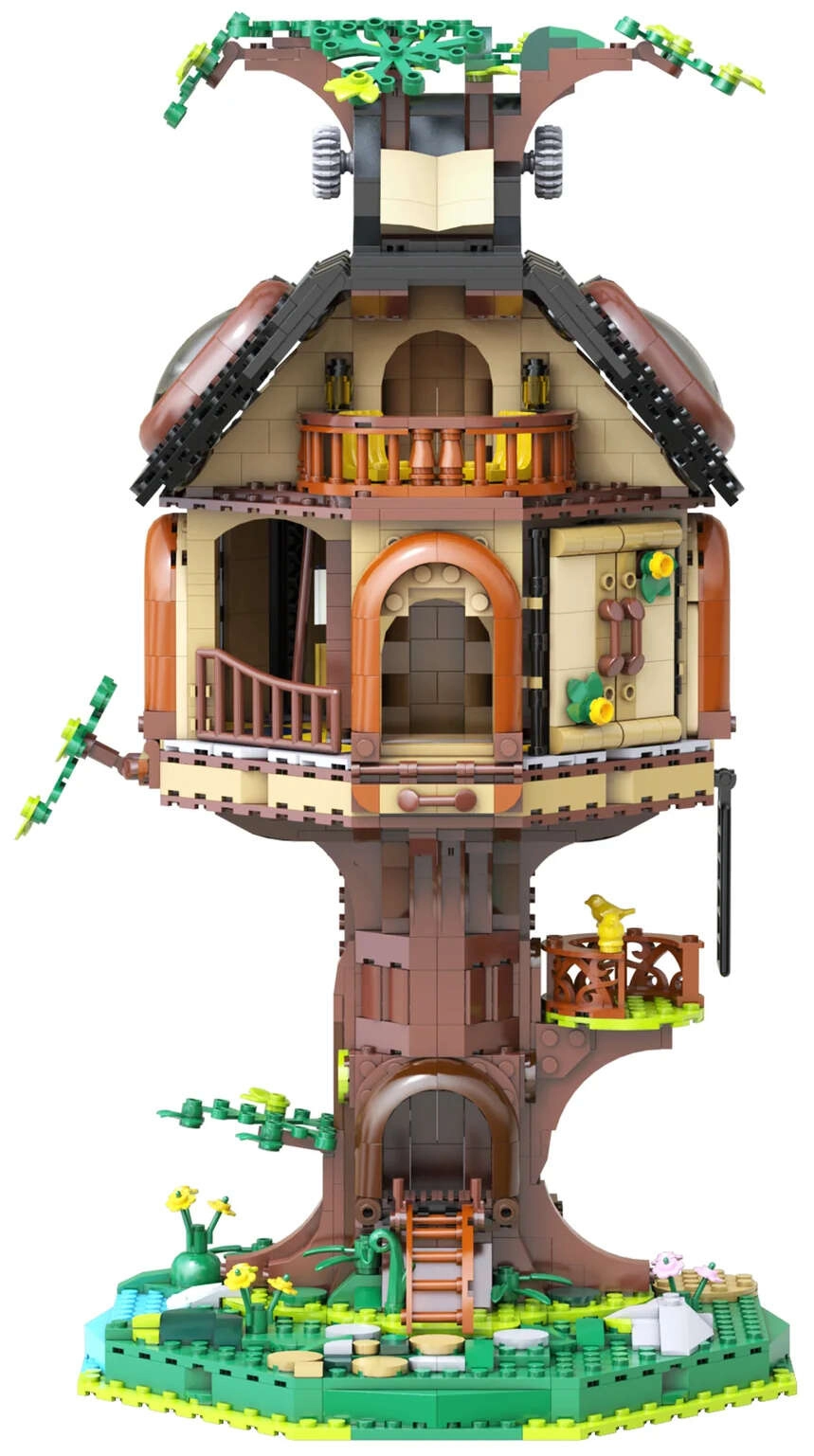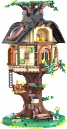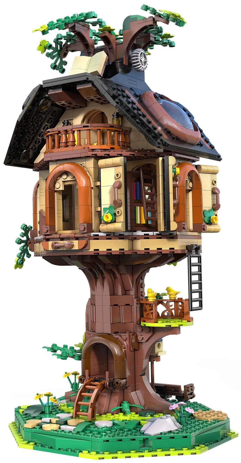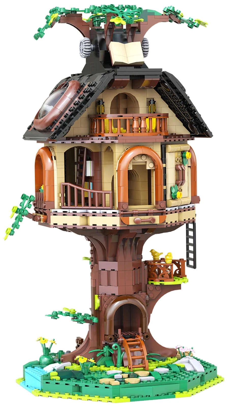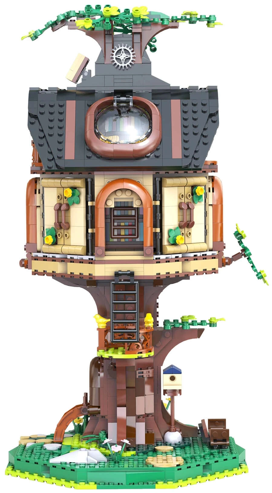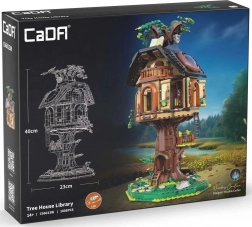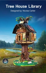 Sestavite edinstveno knjižnico v hiški na drevesu z dvoetažno zasnovo: v pritličju je knjižnica s policami, okni in lestvami, v nadstropju pa prijetna čitalnica s teleskopom. Drevo stoji na slikoviti jasi s cvetjem in ptičjo hišico, ne manjka niti odpirajoča se streha in balkon za opazovanje ptic.