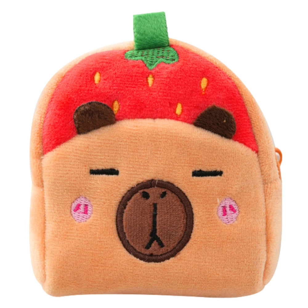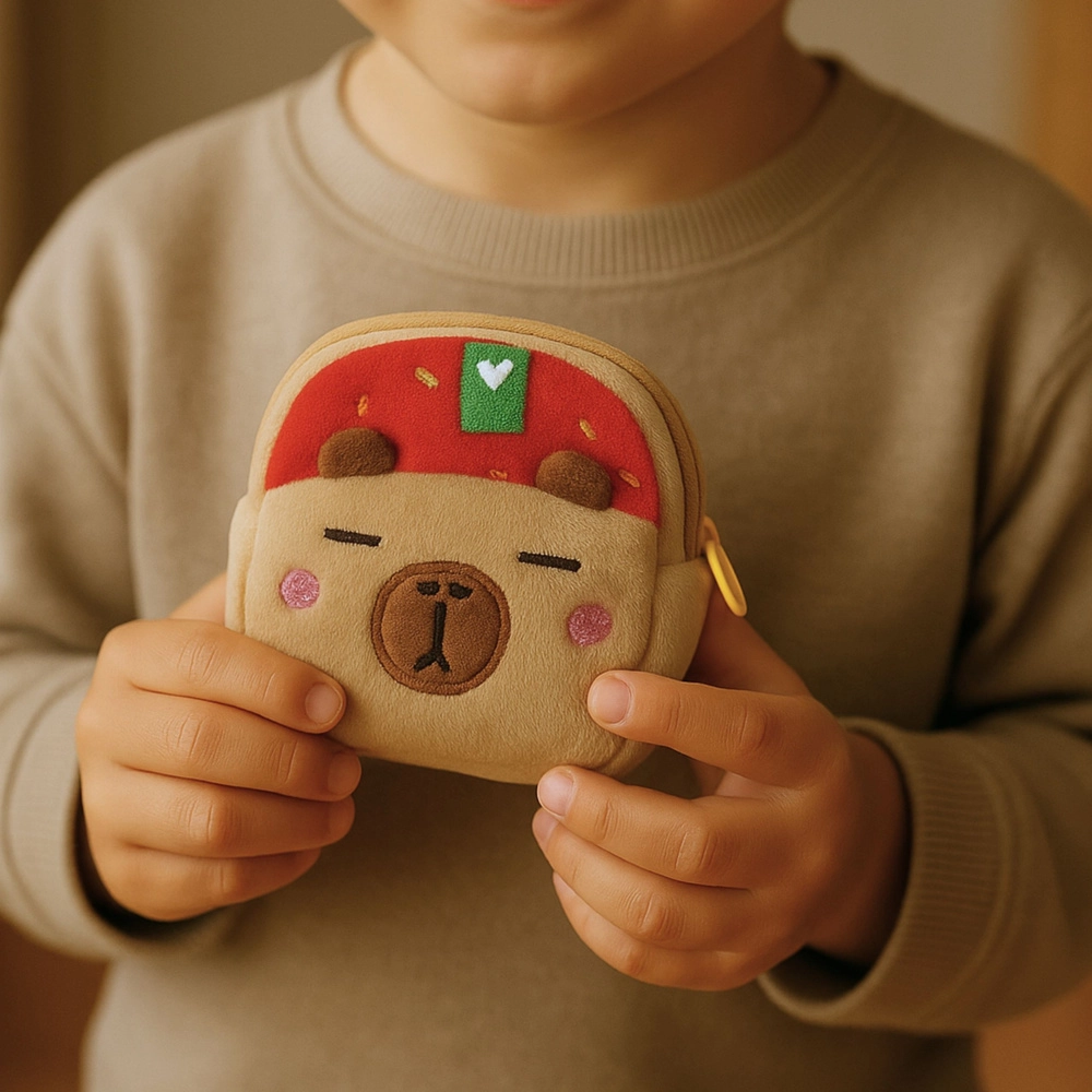Prisrčna plišasta denarnica v obliki kapibare z rdečo jagodko je idealna za otroke in ljubitelje kawaii dodatkov. Je lahka, mehka in prijetna na dotik, ima varno zadrgo in praktično plastično sponko za pritrditev na nahrbtnik ali ključe. Kompaktne mere 9,5 × 8 cm so odlične za kovance, bankovce, ključe in drobne zaklade.