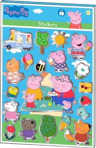 Vesel komplet nalepk z motivi Peppa Pig bo razveselil vsakega malega oboževalca. Vsebuje 6 listov barvitih nalepk velikosti 23 × 15 cm, idealnih za okraševanje zvezkov, dnevnikov, voščilnic ali ustvarjanje.