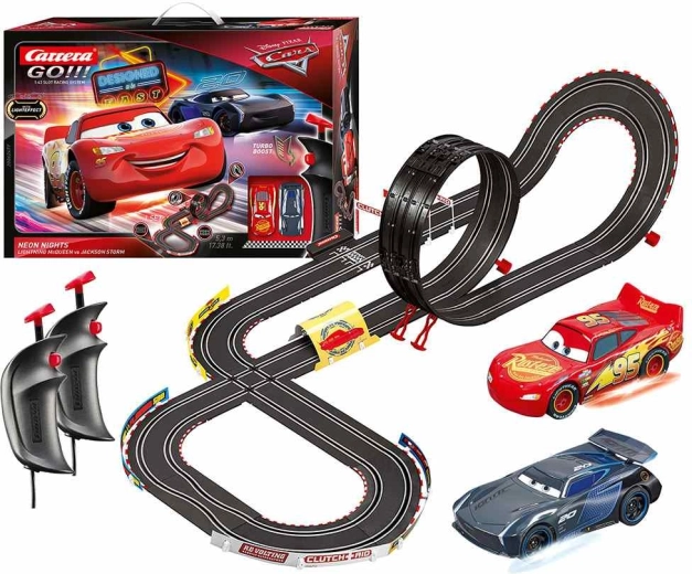 Avtocesta CARRERA GO!!! Cars Neon Nights ponuja akcijske dirke v merilu 1:43 z dvema licenčnima avtomobilčkoma Strela McQueen in Jackson Storm. Zahvaljujoč turbo gumbu na upravljalnikih boste doživeli bliskovito pospeševanje, medtem ko bodo looping, zožanje in križišče preverili vaše vozne spretnosti. Edinstven click sistem omogoča hitro sestavljanje in razstavljanje steze.