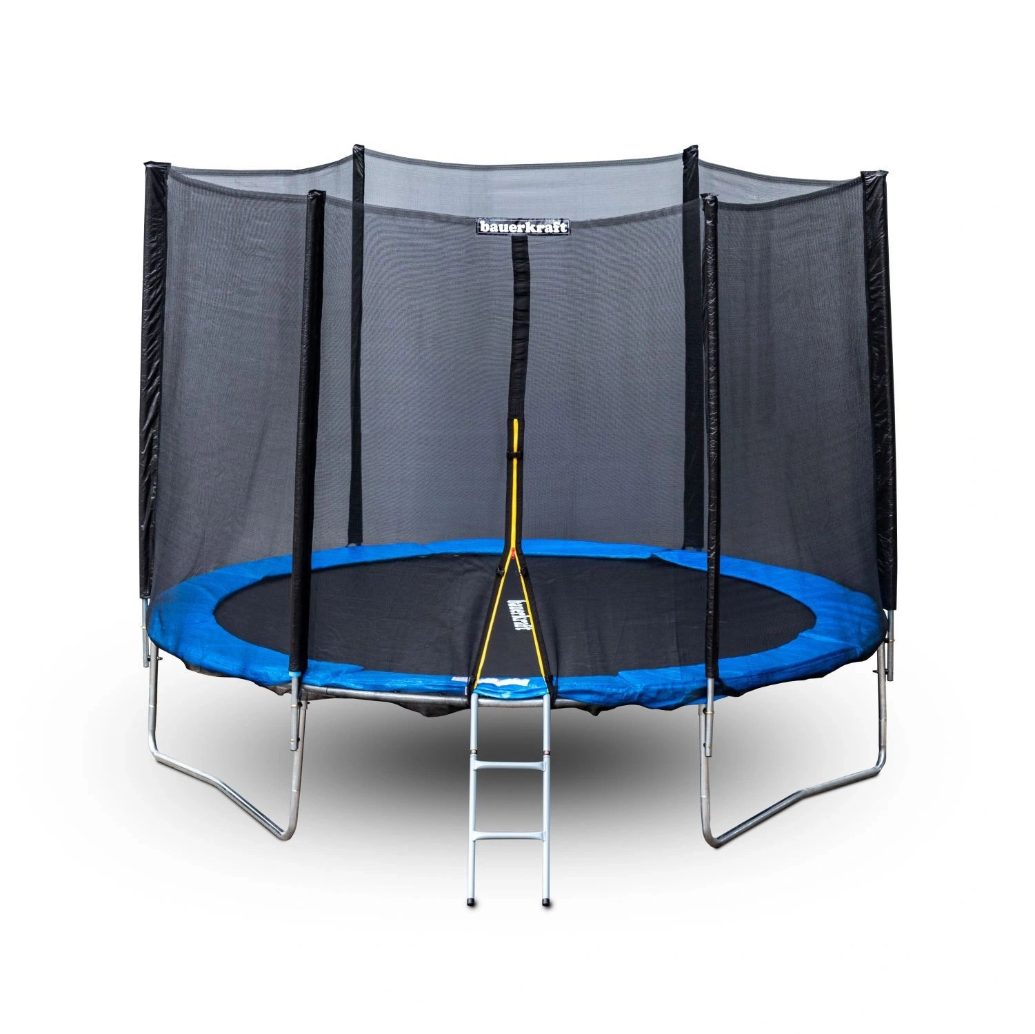 Polnovredna zunanja mreža obkroža celotno skakalno površino in preprečuje padec iz trampoline. Dvojno zapiranje z zadrgo in zaponko ohranja vhod varno zaprt tudi pri intenzivni igri.