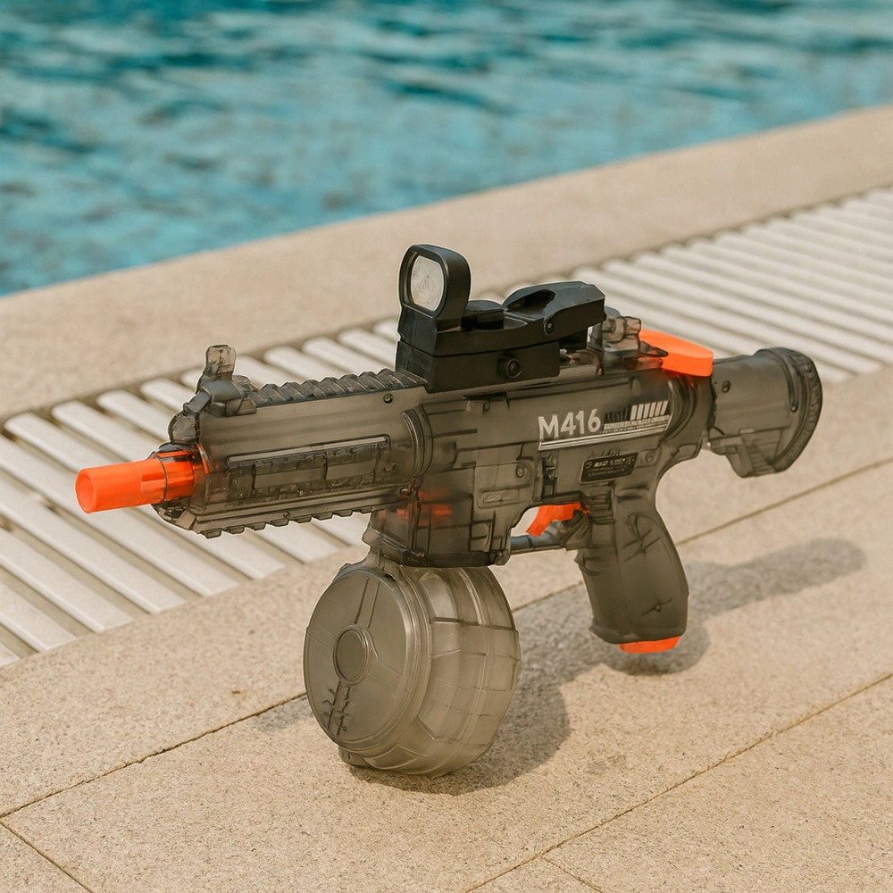 Električna vodna pištola M416 je idealna za zunanje bitke ob bazenu, na vrtu ali na plaži. Ergonomičen ročaj, samodejni pogon in velik bobnasti rezervoar zagotavljajo stabilno delovanje brez nenehnega črpanja. Prosojno ohišje z oranžnimi varnostnimi elementi deluje moderno, učinkovite LED na ustju cevi pa dodajo dinamiko akciji.