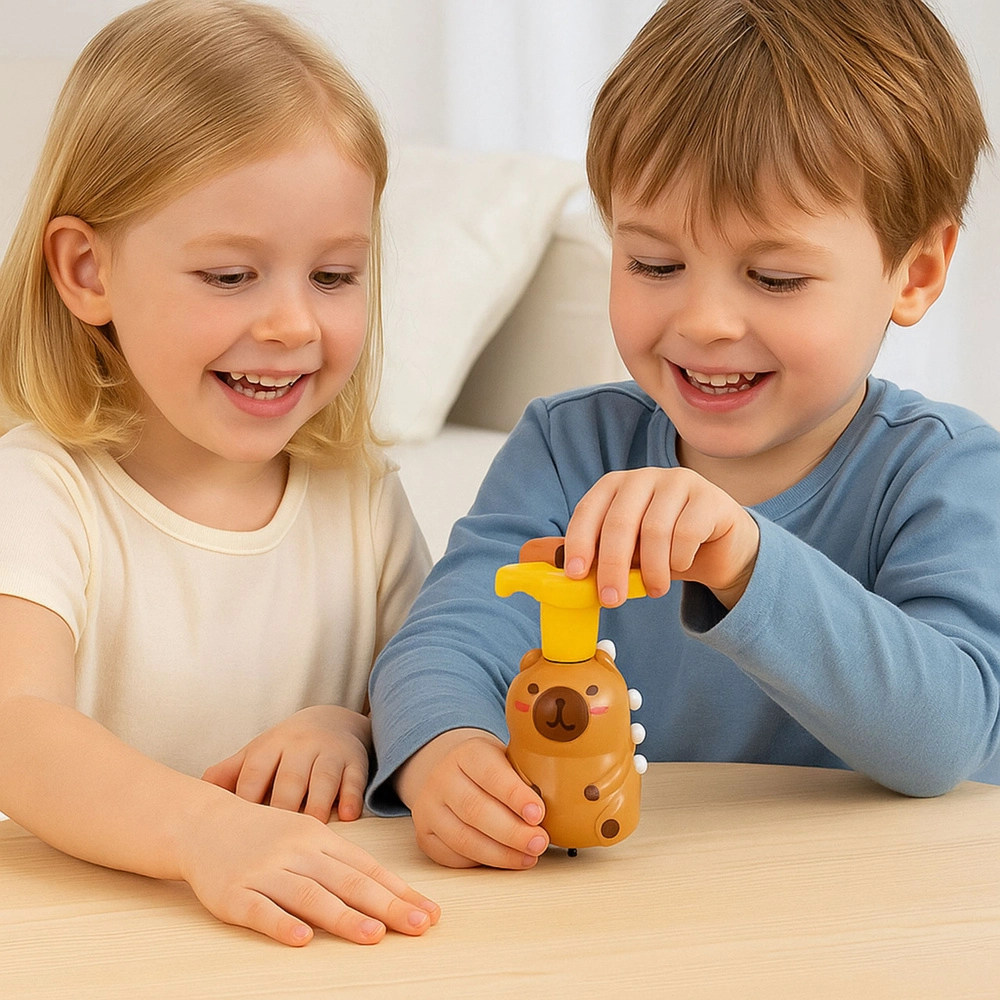 Prisrčna interaktivna vrtavka v obliki kapibare prinaša otrokom veliko zabave zahvaljujoč kombinaciji barvnih LED lučk, veselih melodij in hitrega vrtenja. Dovolj je, da potegnete za zgornji ročaj in igrača se zavrti, navduši z učinki ter spodbuja motoriko in koordinacijo.