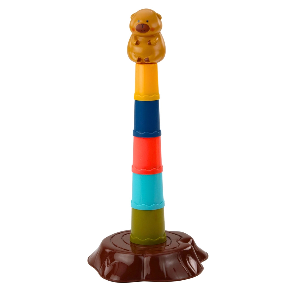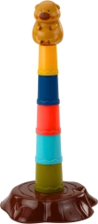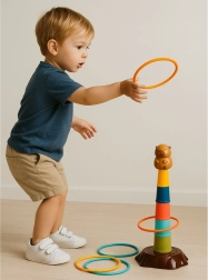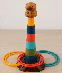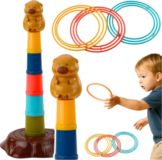 Ta otroška igra metanja obročev prinaša vesel motiv kapibare in enostavno sestavljanje petstopenjskega stolpa. Naloga je metati obroče tako, da pristanejo na stolpu – otroci tako naravno vadijo natančnost, zbranost in koordinacijo oko–roka. Lahki in varni plastični deli so prijetni za držanje in primerni tudi za mlajše otroke.