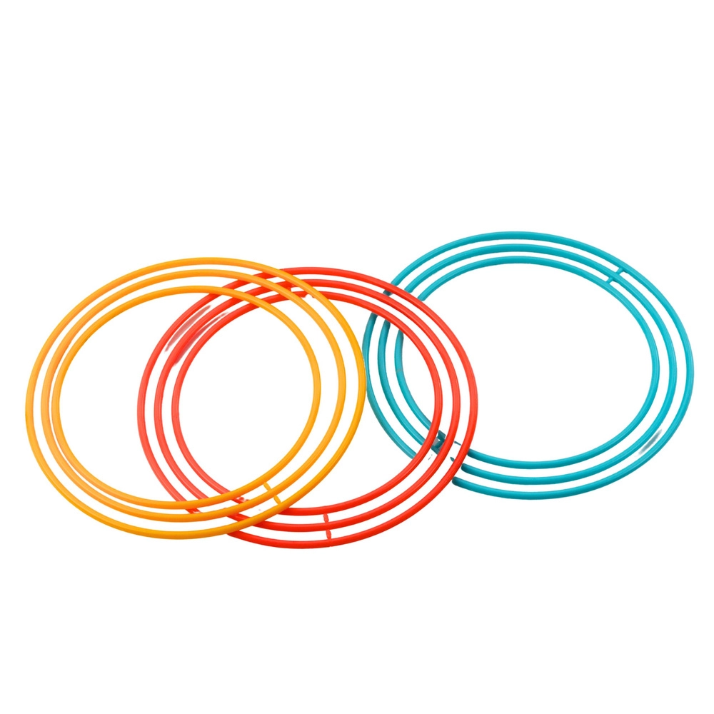 Set vsebuje 9 obročev (3 velike, 3 srednje, 3 majhne) za nastavljive ravni težavnosti in zabavno tekmovanje.