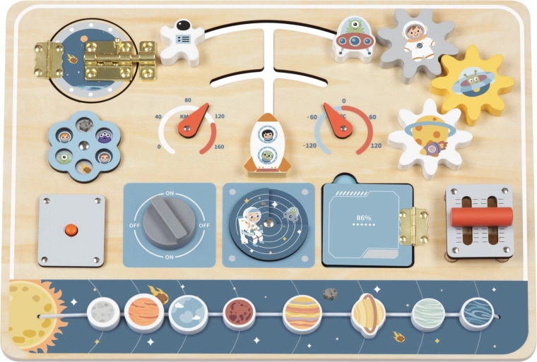 Ta lesena izobraževalna tabla otroke popelje v svet kozmičnih odkritij. Vsak element – od stikal in ročic do vrtečega se radarja – spodbuja radovednost in zbranost. Otroci se igrajo upravljanje vesoljske ladje, spremljajo “inštrumente” ter se učijo skozi dotik, gib in ponavljanje.