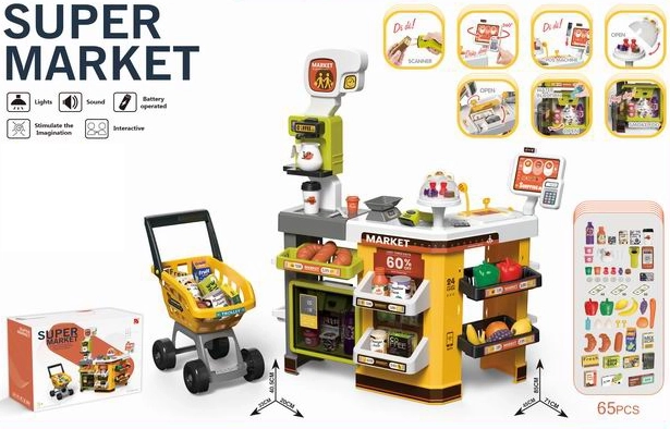 Odkrijte zabaven otroški supermarket s 65 dodatki, ki vsak prostor spremeni v pravi trgovski kotiček. Vključuje nakupovalni voziček, baterijski hladilnik, plačilni terminal in čitalnik za realistično igro. Idealno za razvoj ustvarjalnosti, komunikacije in fine motorike.