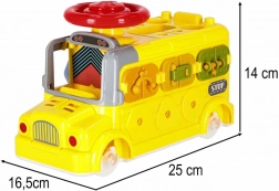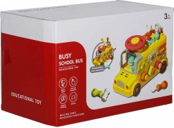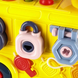 Interaktivni avtobus združuje vozilo in mini delavnico v enem. Otroci lahko vozijo, vijajo, preizkušajo ključavnice s ključi, vrtijo volan in raziskujejo “motor” pod dvižnim pokrovom. Raznolike naloge naravno razvijajo fino motoriko, potrpežljivost in reševanje problemov.