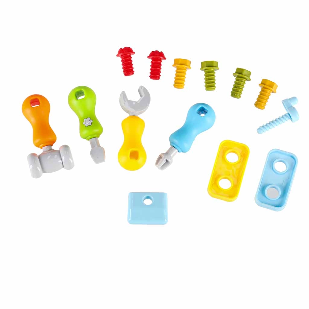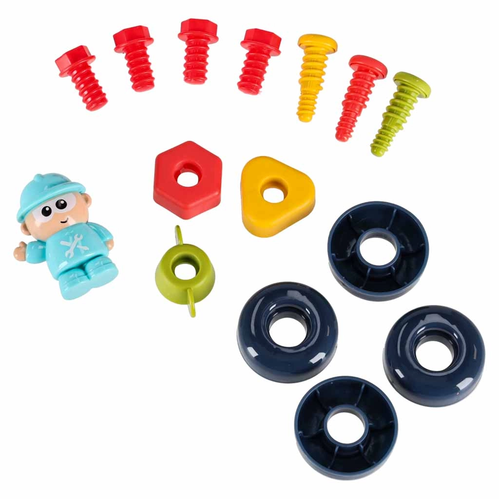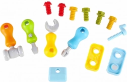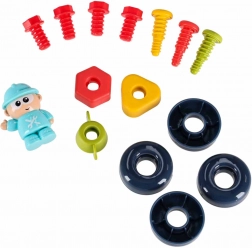 Komplet vsebuje vijake, matice, zobnike, izvijače, ključ in kladivce. Otroci urijo natančnost in koordinacijo pri pritrjevanju delov in učenju oblik.