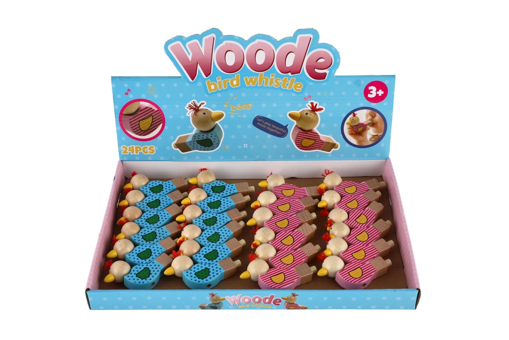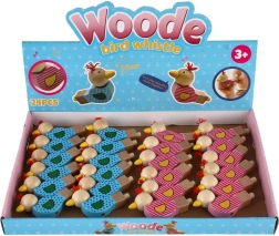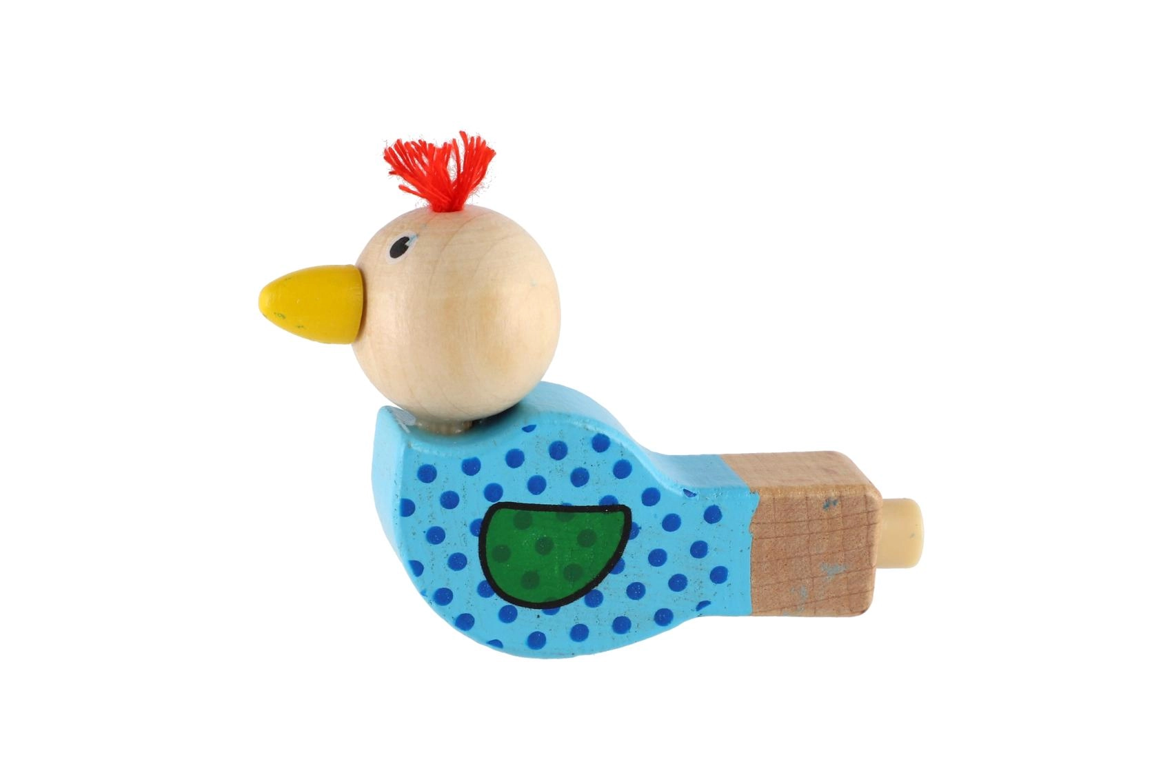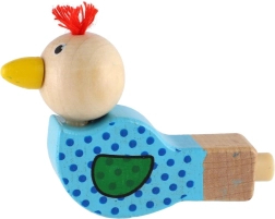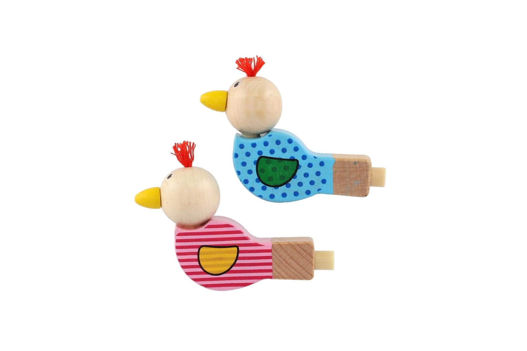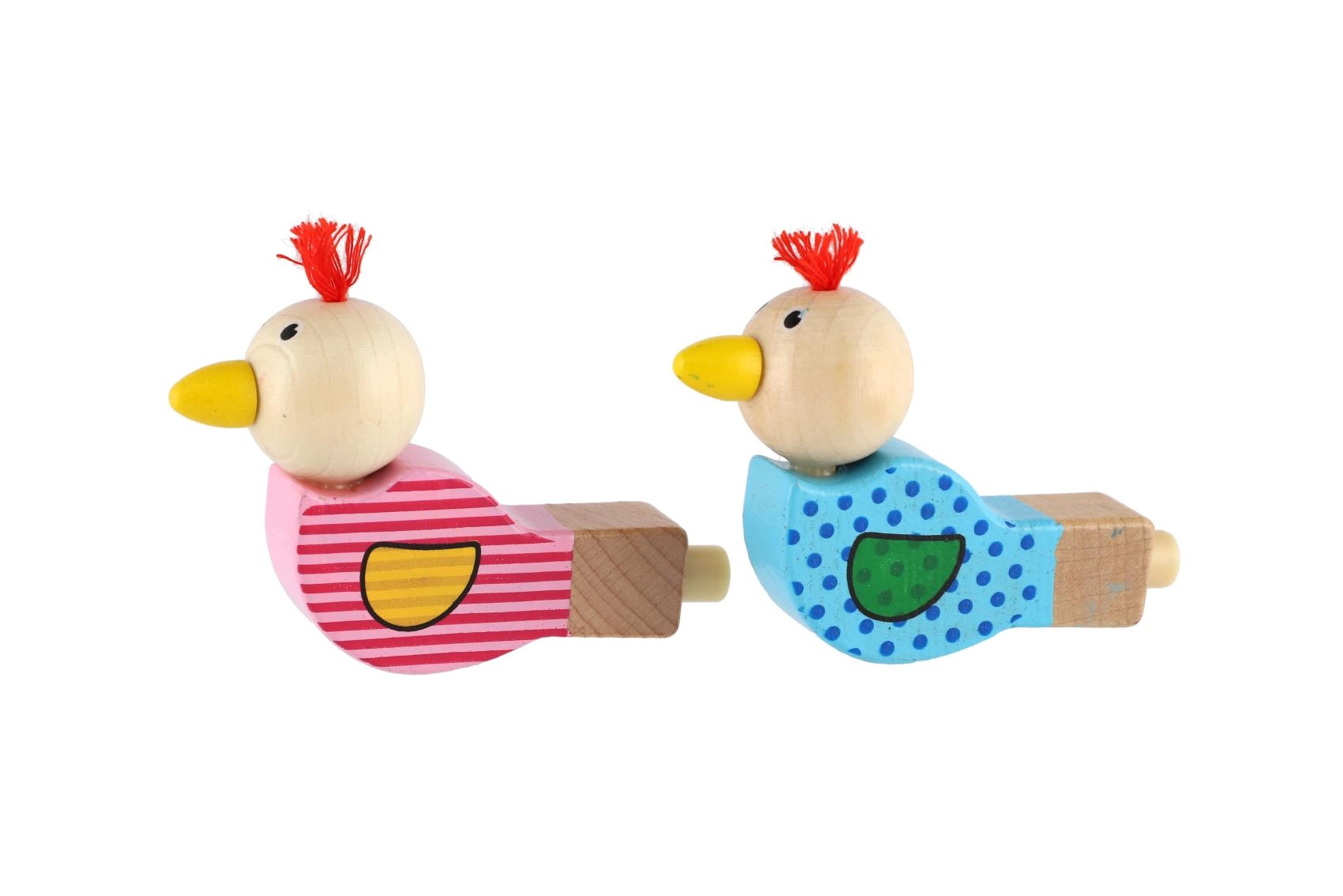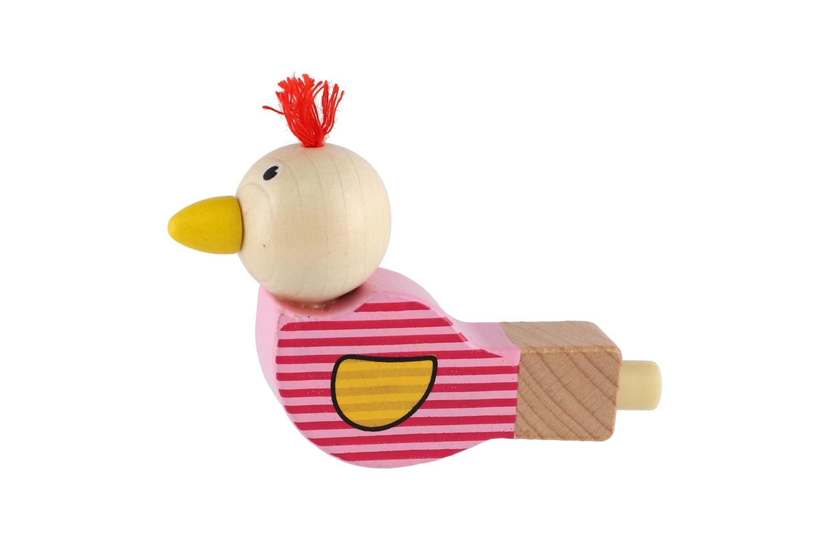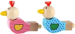 Piščalka je izdelana iz kakovostnega lesa in okrašena z veselimi motivi v rožnati in modri različici. Majhen cof na glavi ptička daje igrači poseben značaj. Odlična je kot drobno darilo, nagrada ali dodatek v otroški zabavni vrečki.