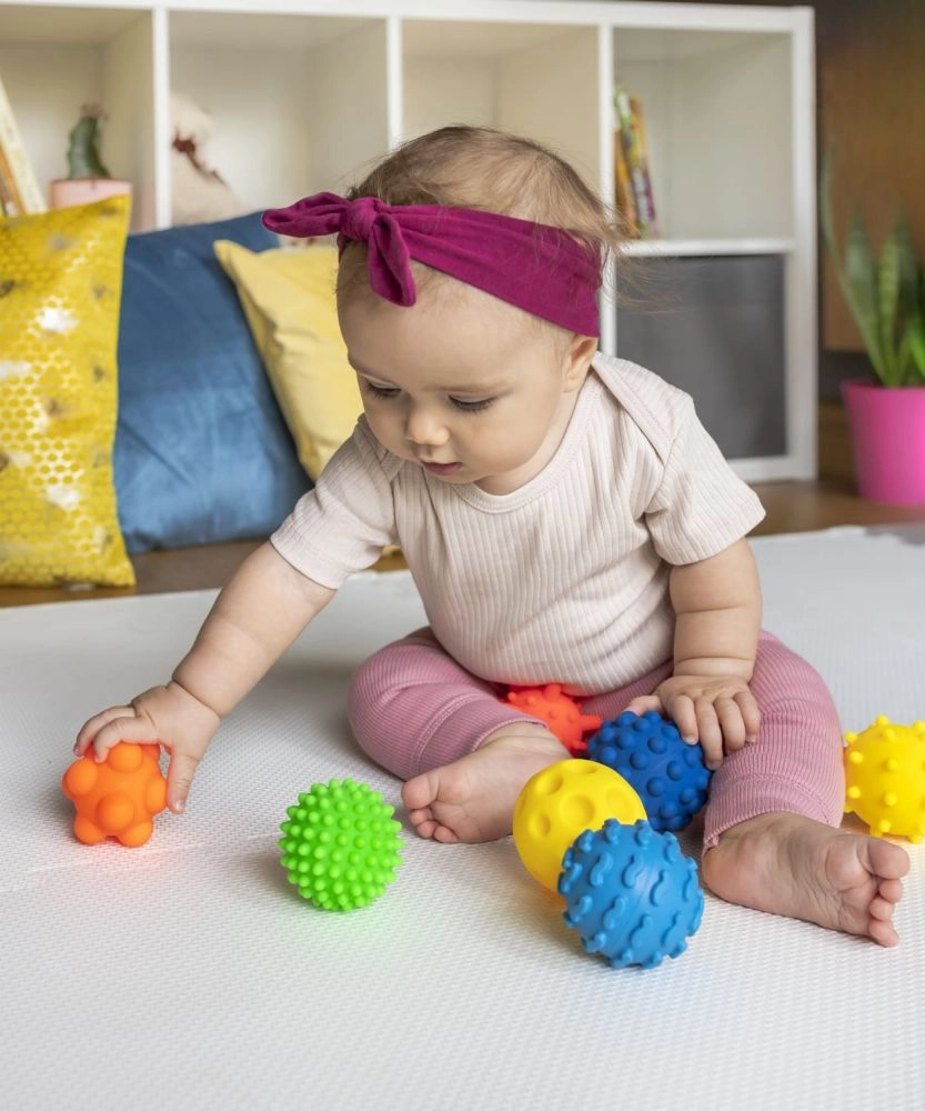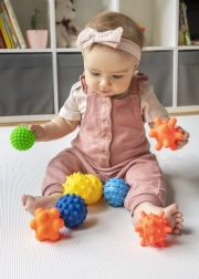 Vsaka žogica ponuja drugačno površino – bodice, izbokline in zareze za intenzivno taktilno stimulacijo in veselje ob odkrivanju.