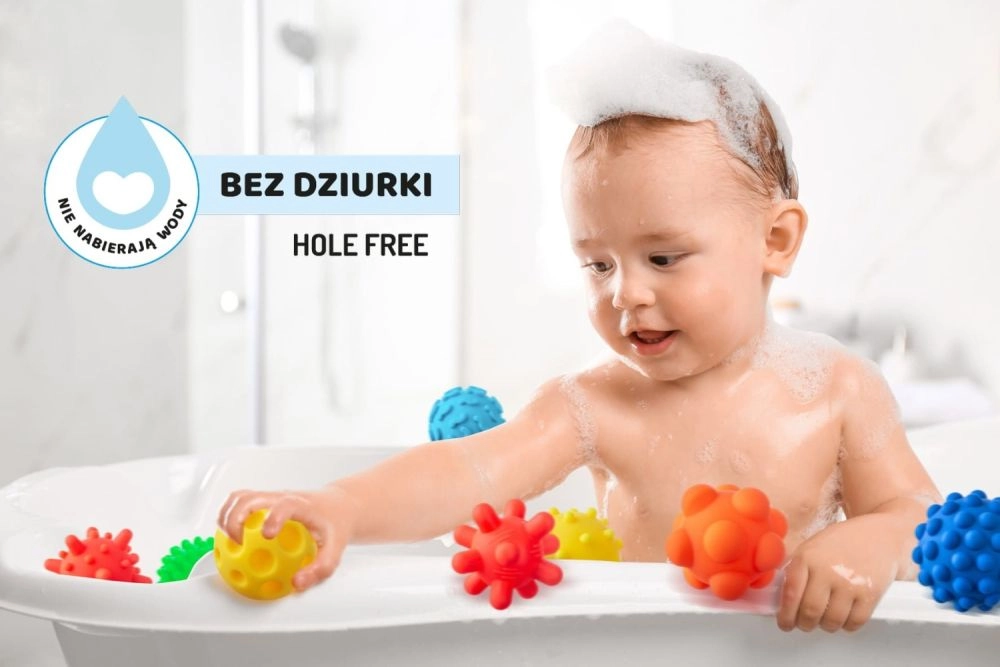 Vsaka žogica ima drugačno strukturo in premer v razponu približno 59–77 mm, da se otrok lahko postopoma uči prijemati predmete različnih velikosti. Konstrukcija brez odprtin preprečuje zadrževanje vode in nečistoč, zato so žogice idealne tudi za kopanje. Izpolnjujejo evropske standarde in prinašajo varno, čutno bogato zabavo doma in na poti.