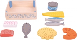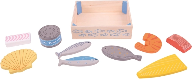 Ta lesena škatla je polna svežih in zdravih rib, kot so losos, tuna v konzervi in kozice. Odličen dodatek k leseni kuhinji za vse male kuharje. Bigjigs Toys lesena hrana spodbuja privlačno učenje o izvoru in pripravi hrane, izboljšuje otroško motoriko in hkrati otroke zabava.
