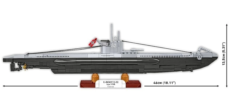 U-BOAT U-52 tip VIIB v merilu 1:144 je natančno izdelan gradbeni set, ki verno ujame oblike in detajle ene najbolj znanih nemških podmornic. Model dolžine približno 46 cm izstopa z realističnimi elementi, kot so periskopi, jambor z ožičenjem, propelerji in palubni detajli. Po sestavi postane impresivna dekoracija na priloženem podstavku z nazivom modela in merilom.