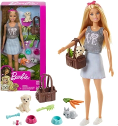Ta očarljiv komplet prinaša vse, kar otroci potrebujejo za zgodbe o skrbi za živalice. BARBIE ima realistične podrobnosti, gibljive okončine in sodoben videz, dopolnjen z belimi supergami in rožnatim naglavnim trakom. V kompletu sta figurici kužka in zajčka ter bogati dodatki za igro hranjenja in nege.