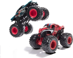 Ta uradno licenciran komplet Monster Jam vsebuje dva natančno izdelana monster tovornjaka v merilu 1:64. Zahvaljujoč robustni zasnovi, prosto vrtečim se kolesom in oprijemljivim pnevmatikam zmoreta skoke, udarce in dramatične dvoboje. Idealno za otroke od 3 let naprej ter navdušene zbiratelje.