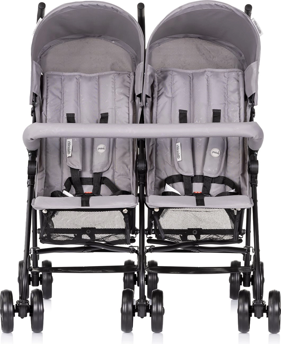 Voziček za dvojčka CHIPOLINO Double Point združuje lahek klasičen okvir s premišljeno opremo za udobje otrok in staršev. Zaradi sedežev, postavljenih drug ob drugem, imata oba mala popotnika dovolj prostora, varnost pa zagotavljajo 5-točkovni pasovi z mehkimi oblazinjenji in skupen sprednji varnostni lok. Nagibne strehice ščitijo pred soncem in vetrom, medtem ko velik shranjevalni koš sprejme vse potrebno za pot.