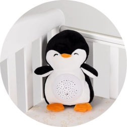 Ta mehak pingvin z vgrajenim projektorjem in glasbeno skrinjico pričara na stenah sobice zvezdno nebo, z nežnimi melodijami pa pomaga otrokom mirno zaspati. Z enim samim pritiskom gumba se projektor začne vrteti in ustvari učinkovito barvno projekcijo, ki umiri vzdušje pred spanjem.