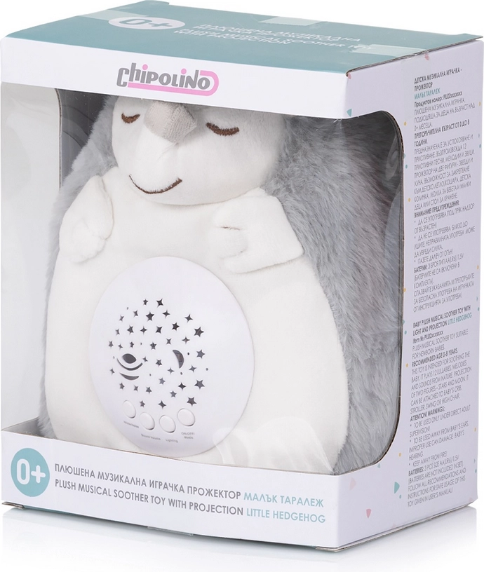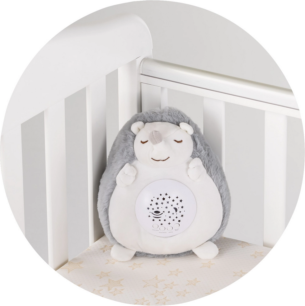 Prisrčen plišasti ježek ustvari mirno vzdušje pred spanjem z barvnim LED projektorjem s kombinacijami rdeče, zelene in modre, ki se nežno izmenjujejo ter projicirajo zvezdice po prostoru. Izberite med 10 uspavankami ali 5 tipi belega šuma (npr. utrip srca, šumenje) in prilagodite večerni ritual trenutnemu razpoloženju otroka.