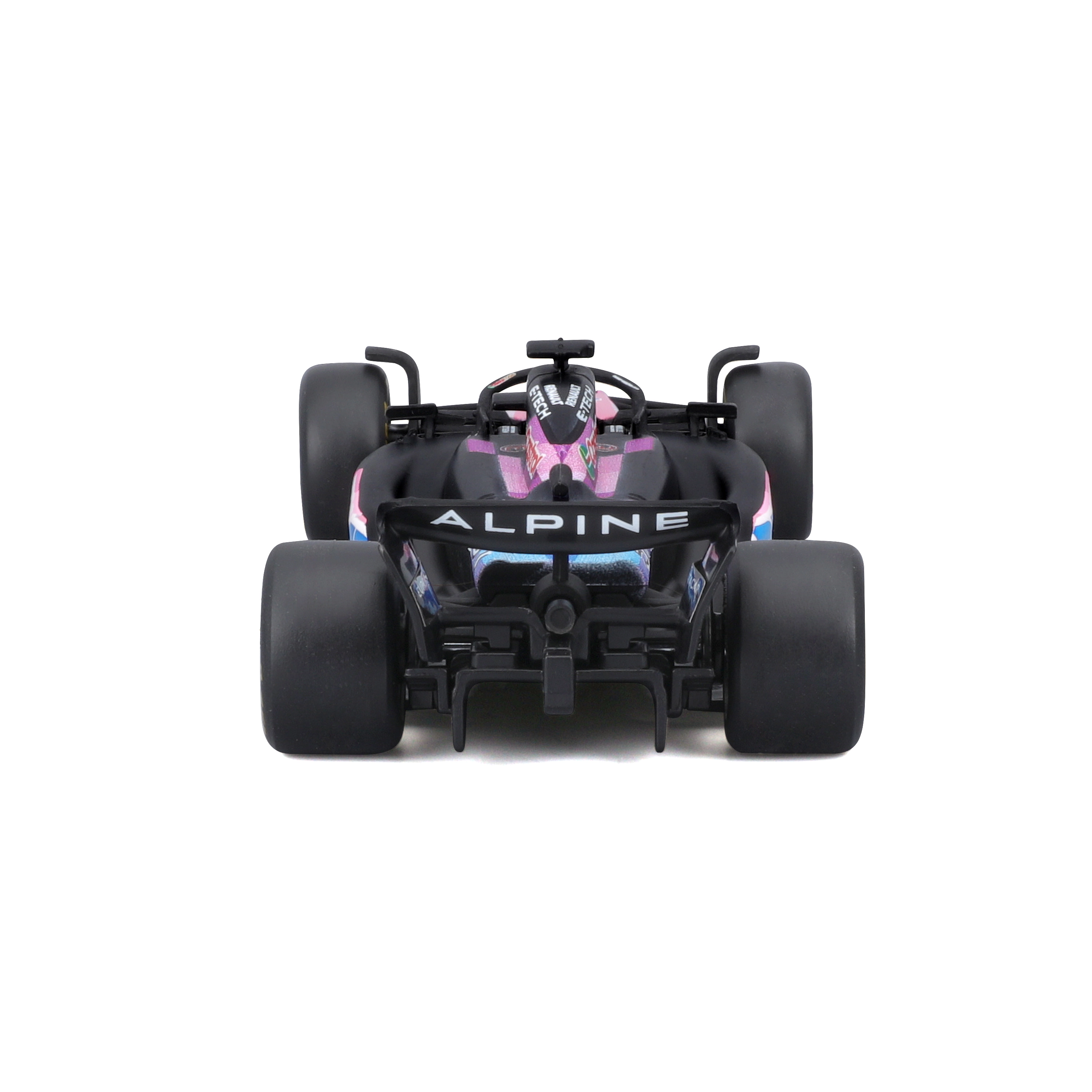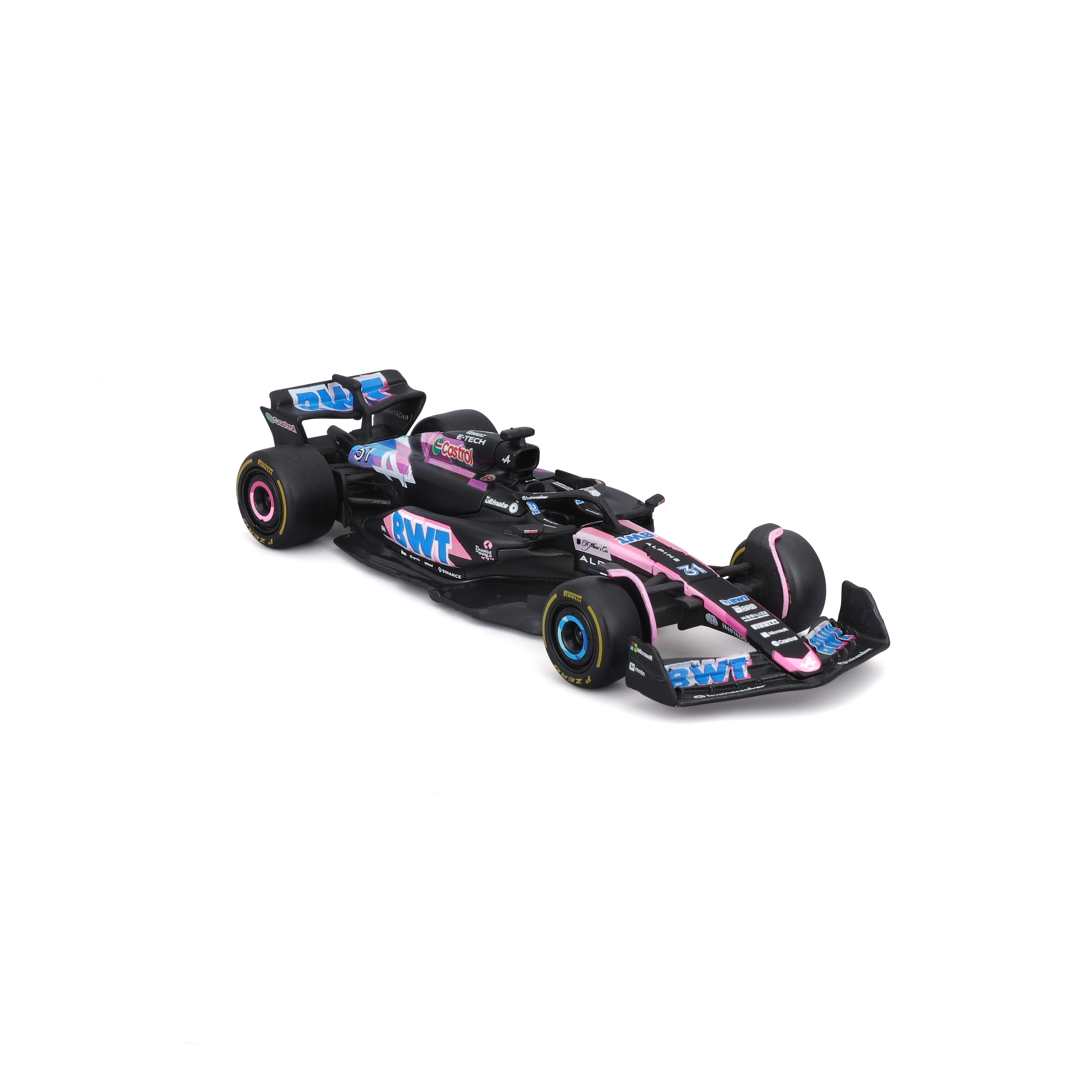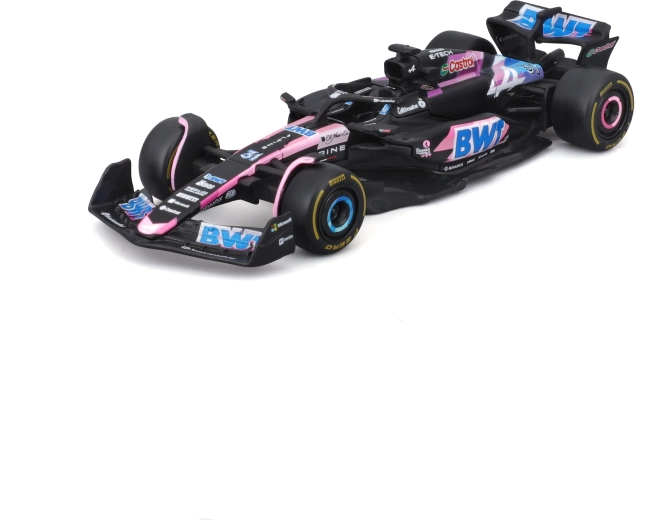 Značilne barve BWT z rožnatimi in modrimi poudarki, natančni logotipi ter dirkaške podrobnosti za realističen videz v vitrini.