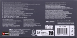 Model je nameščen v prozornem akrilatnem boksu na črnem podstavku, ki ščiti pred prahom in poudari podrobnosti barvne sheme McLAREN.