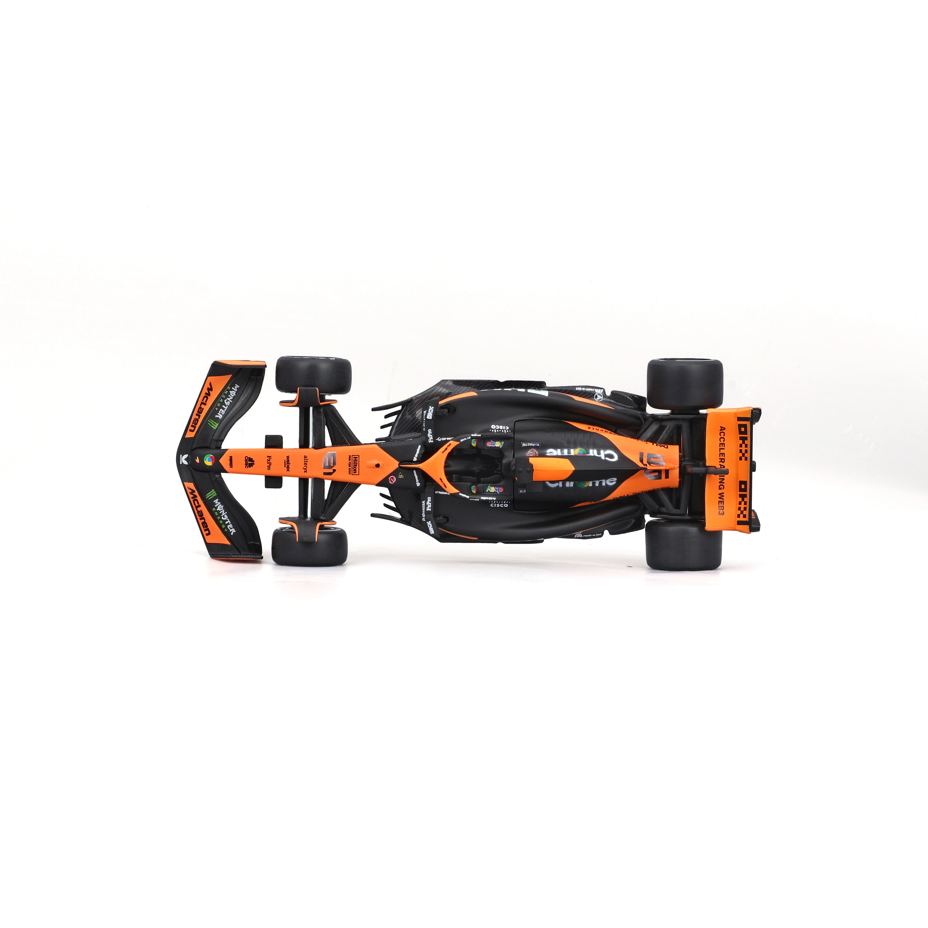 Zvest barvni koncept oranžno‑črne dirkaške poslikave s sponzorskimi logotipi poudari realističen videz modela in prinaša občutek kot na pravi stezi F1.
